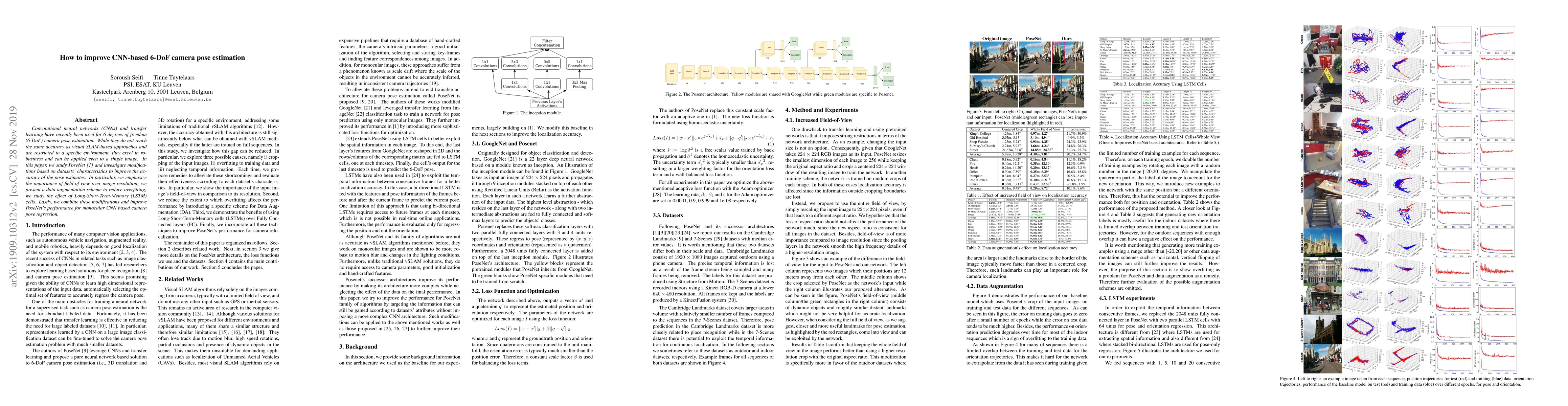 Convolutional neural networks (CNNs) and transfer learning have recently been used for 6 degrees of freedom (6-DoF) camera pose estimation. While they do not reach the same accuracy as visual SLAM-based approaches and are restricted to a specific environment, they excel in robustness and can be applied even to a single image. In this paper, we study PoseNet [1] and investigate modifications based on datasets' characteristics to improve the accuracy of the pose estimates. In particular, we emphasize the importance of field-of-view over image resolution; we present a data augmentation scheme to reduce overfitting; we study the effect of Long-Short-Term-Memory (LSTM) cells. Lastly, we combine these modifications and improve PoseNet's performance for monocular CNN based camera pose regression.
