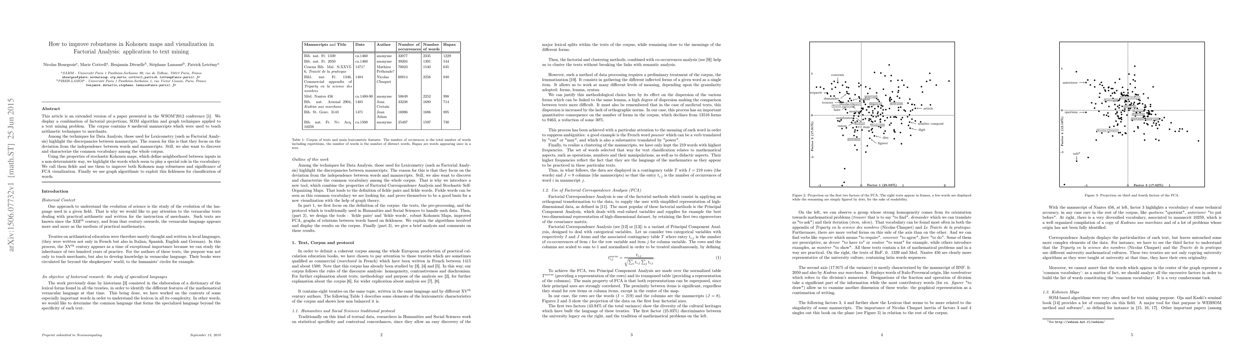 This article is an extended version of a paper presented in the WSOM'2012 conference [1]. We display a combination of factorial projections, SOM algorithm and graph techniques applied to a text mining problem. The corpus contains 8 medieval manuscripts which were used to teach arithmetic techniques to merchants. Among the techniques for Data Analysis, those used for Lexicometry (such as Factorial Analysis) highlight the discrepancies between manuscripts. The reason for this is that they focus on the deviation from the independence between words and manuscripts. Still, we also want to discover and characterize the common vocabulary among the whole corpus. Using the properties of stochastic Kohonen maps, which define neighborhood between inputs in a non-deterministic way, we highlight the words which seem to play a special role in the vocabulary. We call them fickle and use them to improve both Kohonen map robustness and significance of FCA visualization. Finally we use graph algorithmic to exploit this fickleness for classification of words.