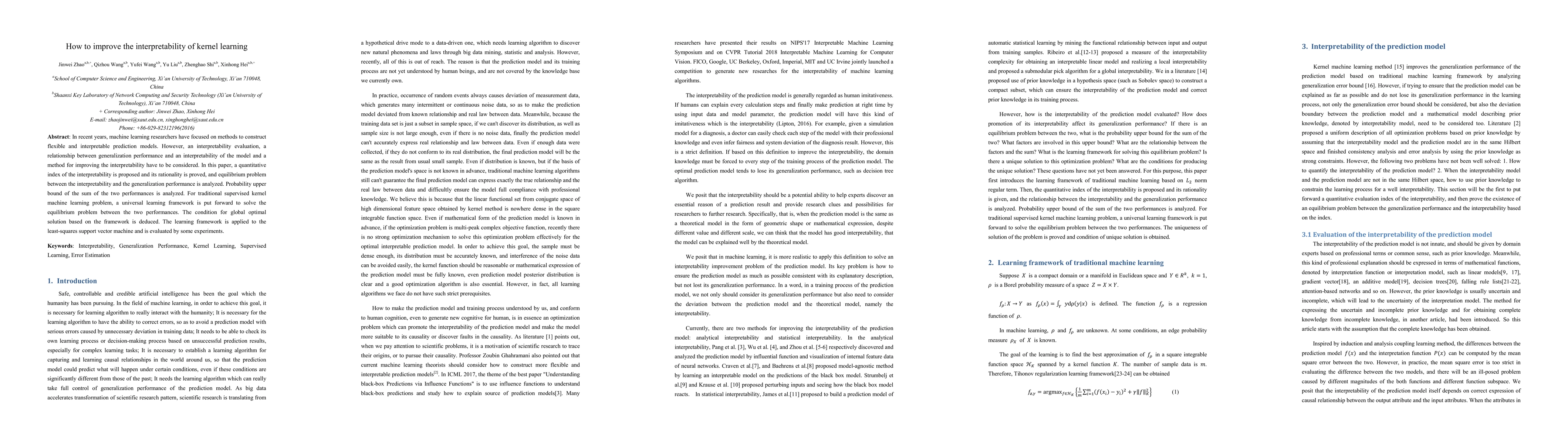 In recent years, machine learning researchers have focused on methods to construct flexible and interpretable prediction models. However, an interpretability evaluation, a relationship between generalization performance and an interpretability of the model and a method for improving the interpretability have to be considered. In this paper, a quantitative index of the interpretability is proposed and its rationality is proved, and equilibrium problem between the interpretability and the generalization performance is analyzed. Probability upper bound of the sum of the two performances is analyzed. For traditional supervised kernel machine learning problem, a universal learning framework is put forward to solve the equilibrium problem between the two performances. The condition for global optimal solution based on the framework is deduced. The learning framework is applied to the least-squares support vector machine and is evaluated by some experiments.
