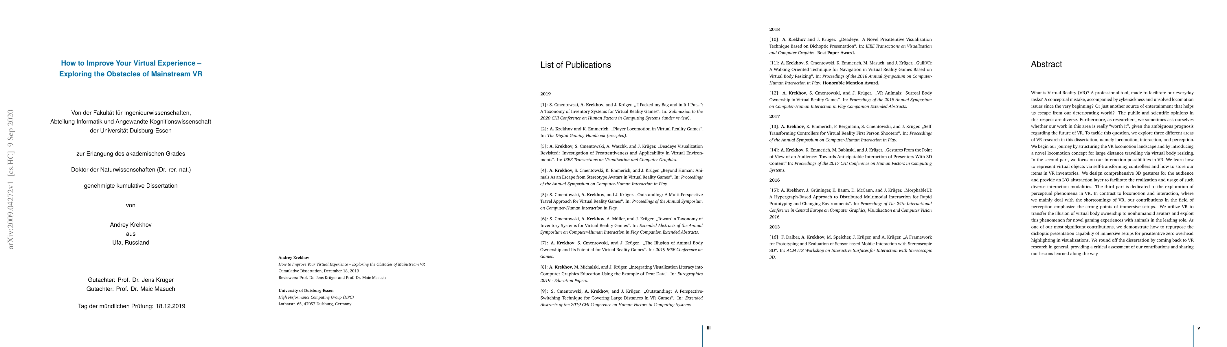 What is Virtual Reality? A professional tool, made to facilitate our everyday tasks? A conceptual mistake, accompanied by cybersickness and unsolved locomotion issues since the very beginning? Or just another source of entertainment that helps us escape from our deteriorating world? The public and scientific opinions in this respect are diverse. Furthermore, as researchers, we sometimes ask ourselves whether our work in this area is really "worth it", given the ambiguous prognosis regarding the future of VR. To tackle this question, we explore three different areas of VR research in this dissertation, namely locomotion, interaction, and perception. We begin our journey by structuring VR locomotion and by introducing a novel locomotion concept for large distance traveling via virtual body resizing. In the second part, we focus on our interaction possibilities in VR. We learn how to represent virtual objects via self-transforming controllers and how to store our items in VR inventories. We design comprehensive 3D gestures for the audience and provide an I/O abstraction layer to facilitate the realization and usage of such diverse interaction modalities. The third part is dedicated to the exploration of perceptual phenomena in VR. In contrast to locomotion and interaction, our contributions in the field of perception emphasize the strong points of immersive setups. We utilize VR to transfer the illusion of virtual body ownership to nonhumanoid avatars and exploit this phenomenon for novel gaming experiences with animals in the leading role. As one of our contributions, we demonstrate how to repurpose the dichoptic presentation capability of immersive setups for preattentive zero-overhead highlighting in visualizations. We round off the dissertation by coming back to VR research in general, providing a critical assessment of our contributions and sharing our lessons learned along the way.