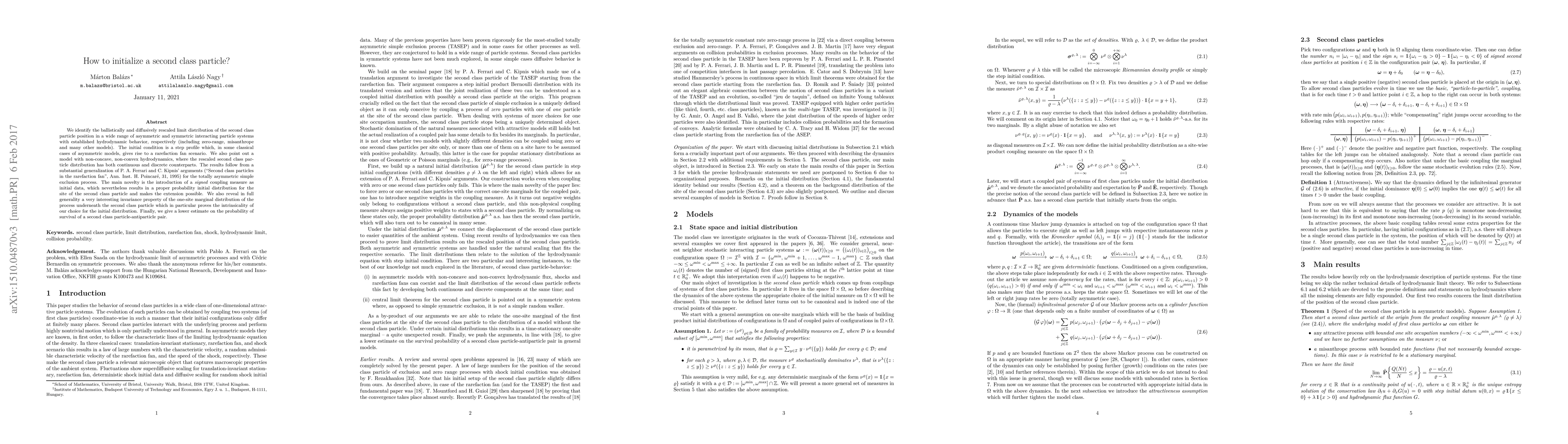 This paper investigates the initial conditions for second class particles in various interacting particle systems, identifying their rescaled limit distributions. It introduces a signed coupling measure for initial data, ensuring a valid probability distribution, and reveals an invariance property of the underlying process, while also providing a lower estimate for the survival probability of second class particle-antiparticle pairs.