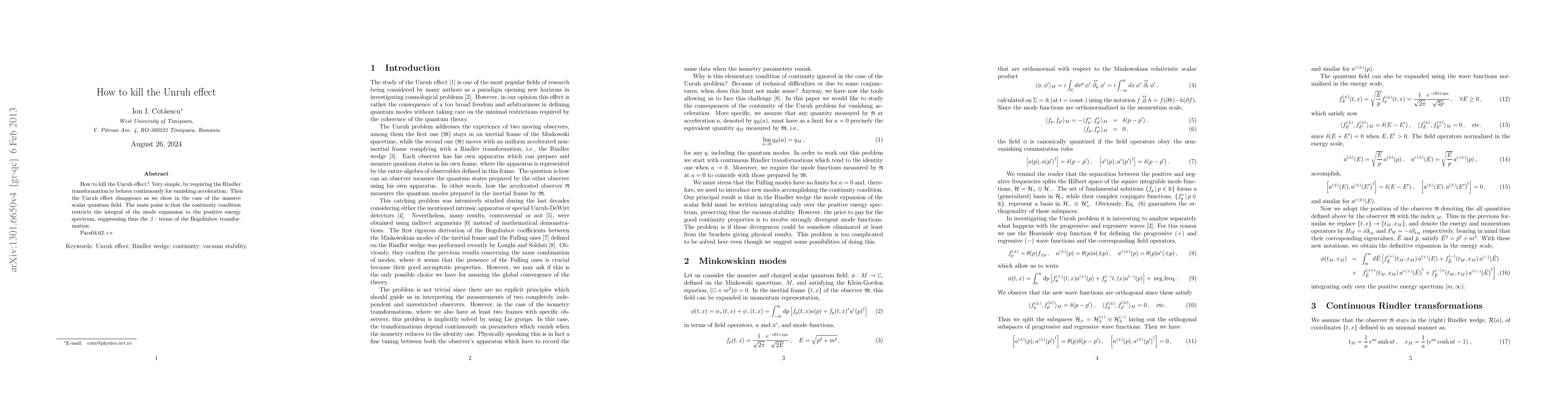 How to kill the Unruh effect? Very simple, by requiring the Rindler transformation to behave continuously for vanishing acceleration. Then the Unruh effect disappears as we show in the case of the massive scalar quantum field. The main point is that the continuity condition restricts the integral of the mode expansion to the positive energy spectrum, suppressing thus the $\beta$ - terms of the Bogoliubov transformation.