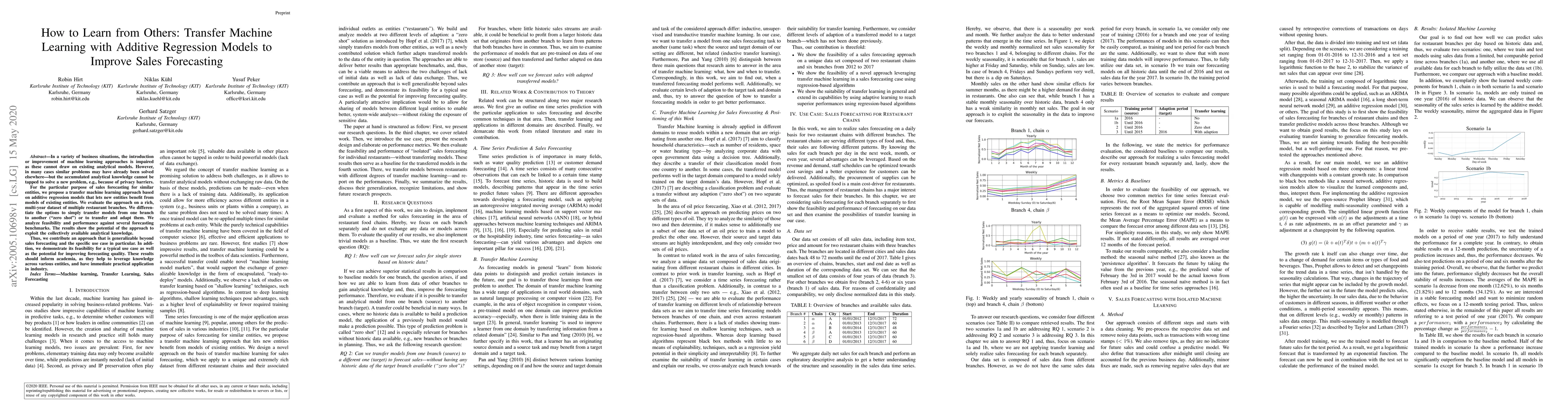 In a variety of business situations, the introduction or improvement of machine learning approaches is impaired as these cannot draw on existing analytical models. However, in many cases similar problems may have already been solved elsewhere-but the accumulated analytical knowledge cannot be tapped to solve a new problem, e.g., because of privacy barriers. For the particular purpose of sales forecasting for similar entities, we propose a transfer machine learning approach based on additive regression models that lets new entities benefit from models of existing entities. We evaluate the approach on a rich, multi-year dataset of multiple restaurant branches. We differentiate the options to simply transfer models from one branch to another ("zero shot") or to transfer and adapt them. We analyze feasibility and performance against several forecasting benchmarks. The results show the potential of the approach to exploit the collectively available analytical knowledge. Thus, we contribute an approach that is generalizable beyond sales forecasting and the specific use case in particular. In addition, we demonstrate its feasibility for a typical use case as well as the potential for improving forecasting quality. These results should inform academia, as they help to leverage knowledge across various entities, and have immediate practical application in industry.