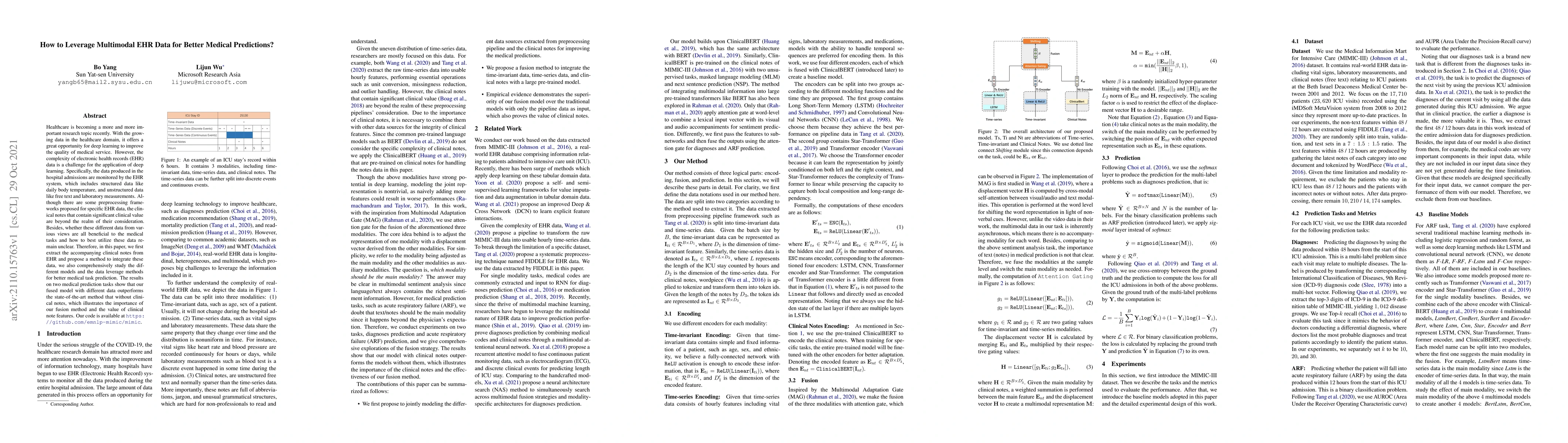 This paper proposes a method to integrate multimodal electronic health records (EHR) data, including clinical notes, to improve medical predictions. The study demonstrates that combining structured and unstructured EHR data, especially clinical notes, significantly enhances prediction performance compared to state-of-the-art methods that exclude these notes.