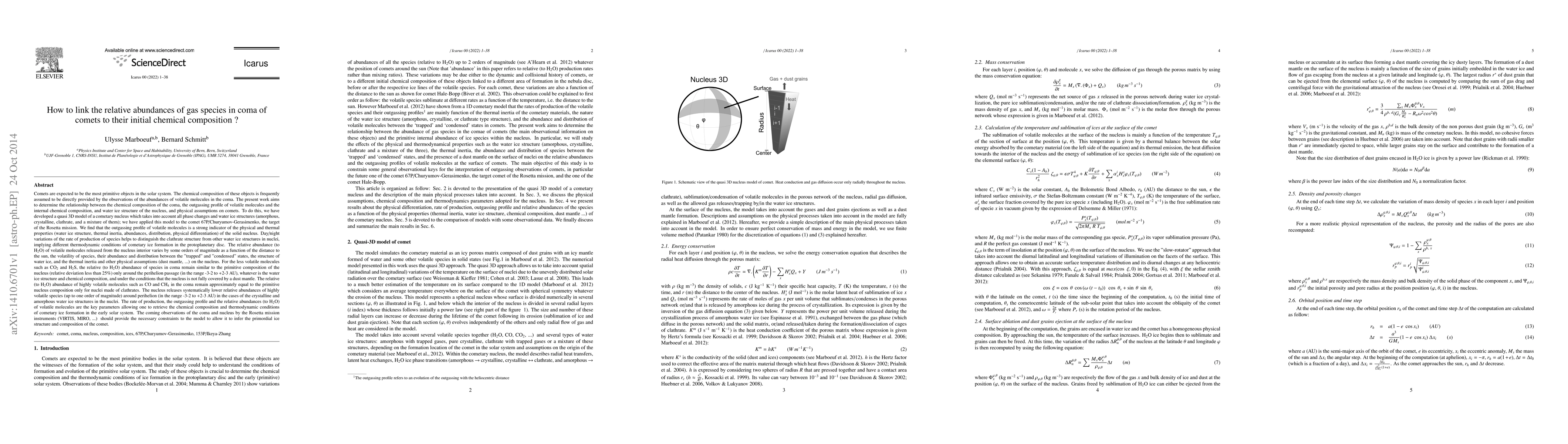 A study linked comet coma gas species abundances to their initial chemical composition, finding that outgassing profiles reveal physical properties of the nucleus, including water ice structure and thermal inertia.