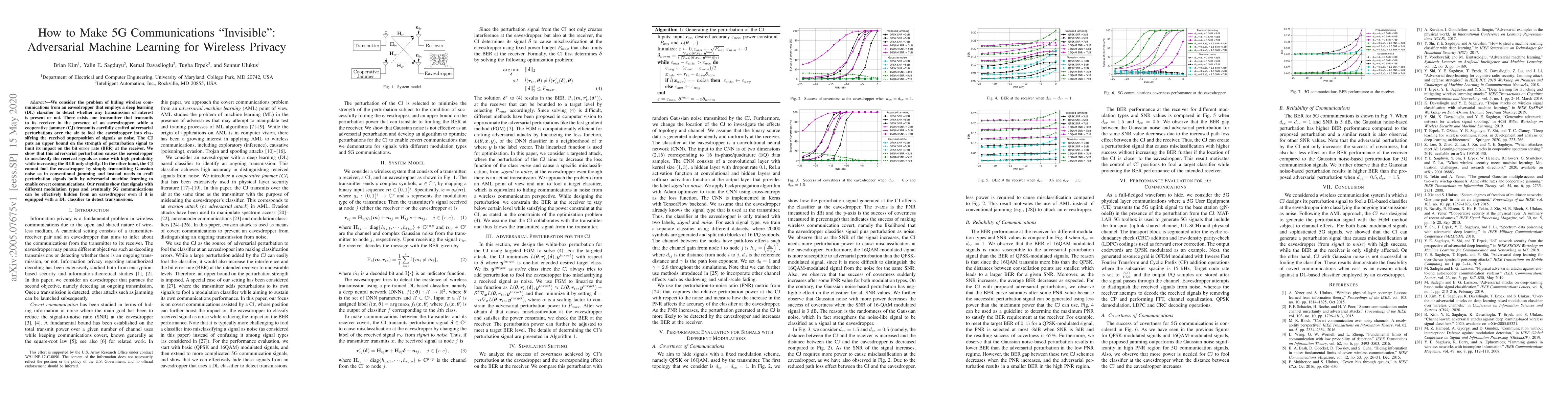 This paper explores using adversarial machine learning techniques to conceal 5G communications from eavesdroppers employing deep learning classifiers. A cooperative jammer crafts adversarial perturbations to mislead the eavesdropper, allowing covert transmissions with minimal impact on the receiver's bit error rate.
