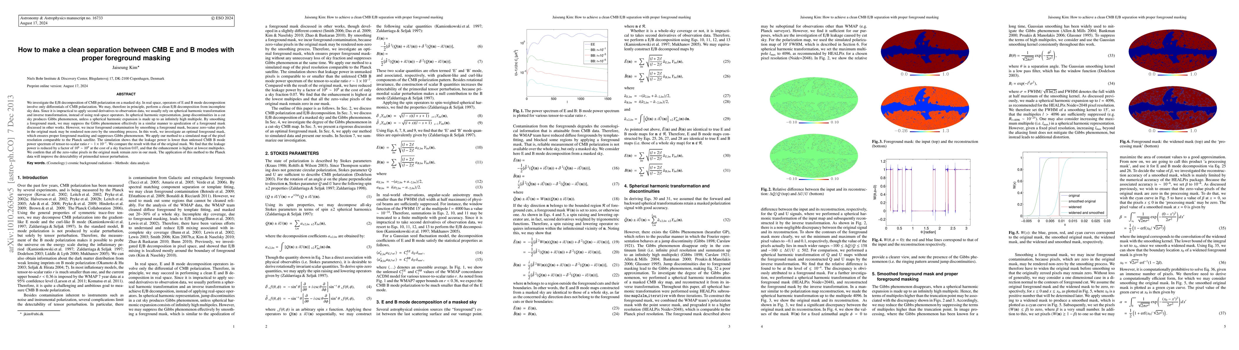 This work presents a novel approach to reducing leakage power in E/B decomposition using spherical harmonic transformation and smoothing foreground masks.
