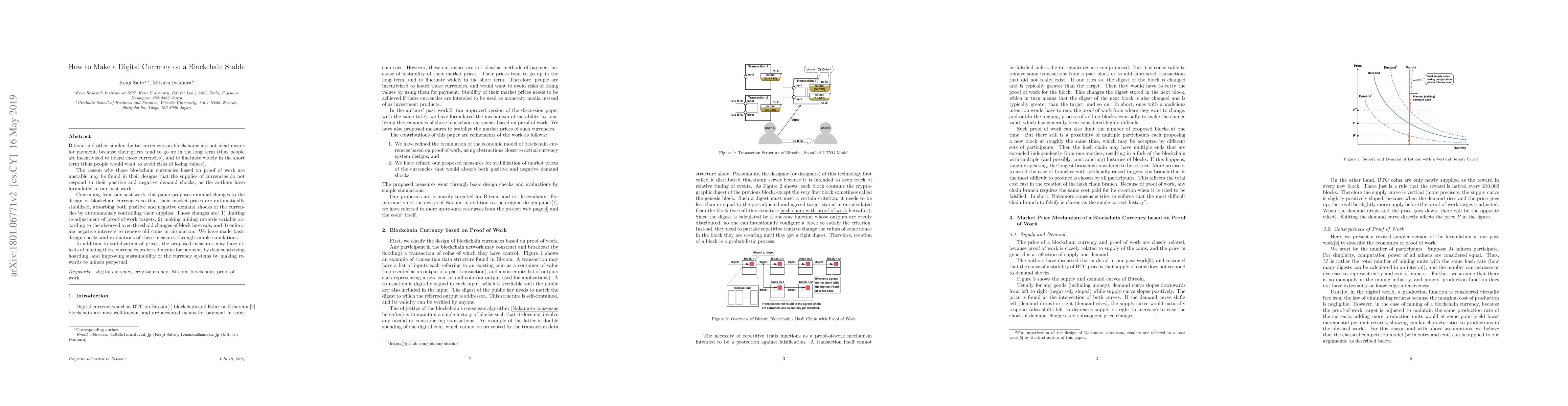 This paper proposes three design changes to stabilize the market prices of digital currencies on blockchains, reducing price volatility and incentivizing payment over hoarding. The proposed measures may also improve sustainability by making miner rewards perpetual and disincentivizing old coins from circulation.