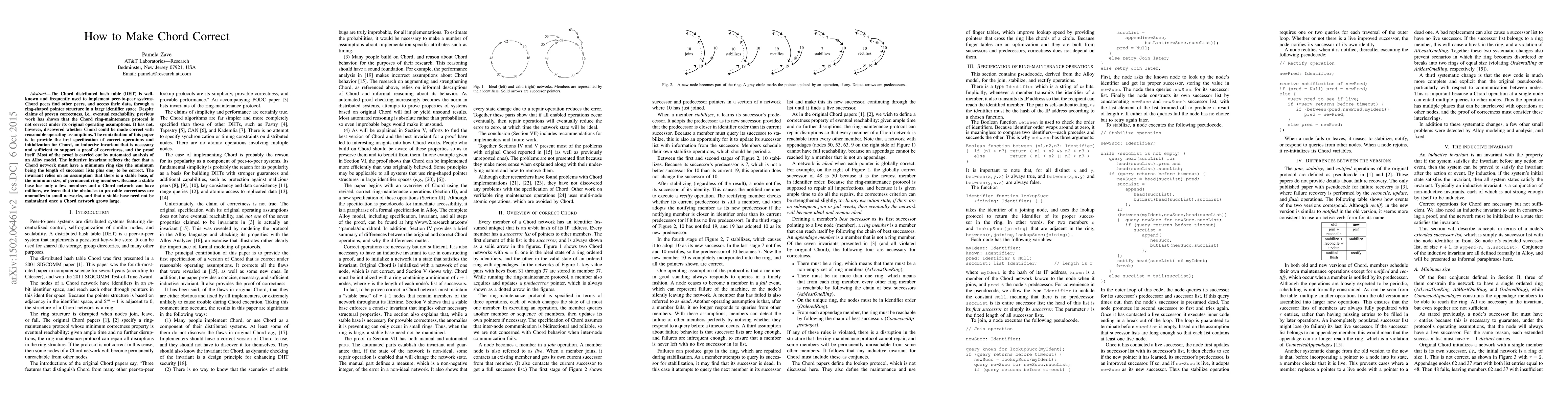 This paper provides a corrected specification for Chord's operations and initialization, showing that small network anomalies can hinder provable correctness, while large networks do not require a stable base to maintain functionality.