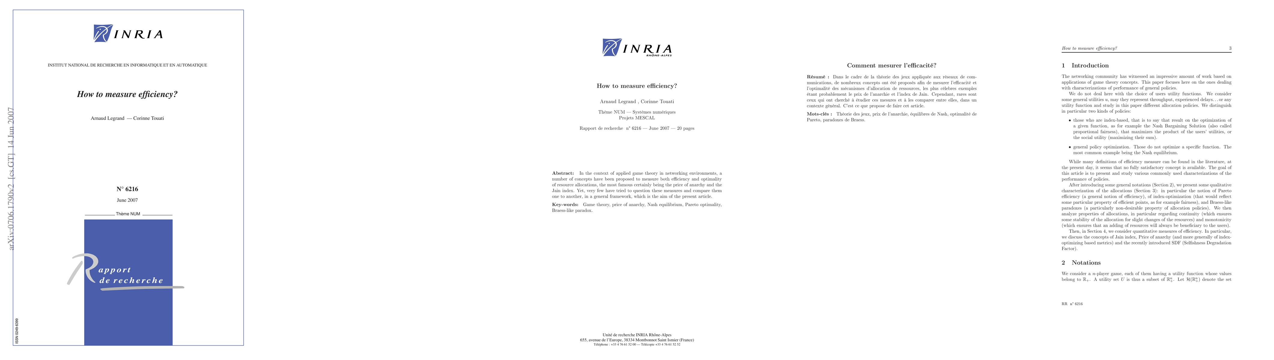 In the context of applied game theory in networking environments, a number of concepts have been proposed to measure both efficiency and optimality of resource allocations, the most famous certainly being the price of anarchy and the Jain index. Yet, very few have tried to question these measures and compare them one to another, in a general framework, which is the aim of the present article.