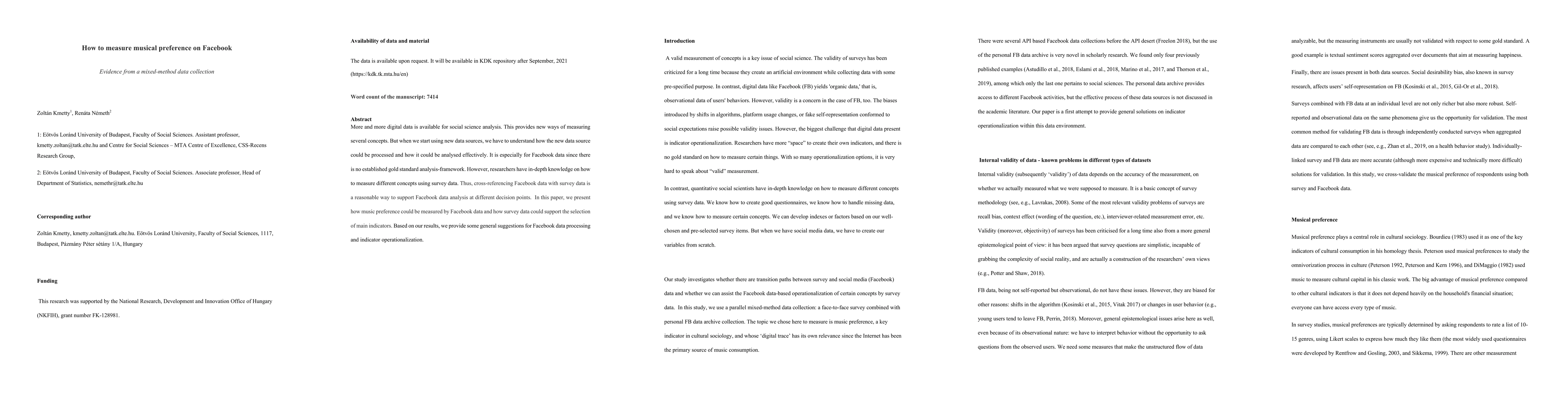 This paper explores the measurement of musical preference using Facebook data, combining mixed-method approaches. It suggests cross-referencing Facebook data with survey data to validate and refine the analysis, offering guidelines for processing and operationalizing indicators in Facebook data.