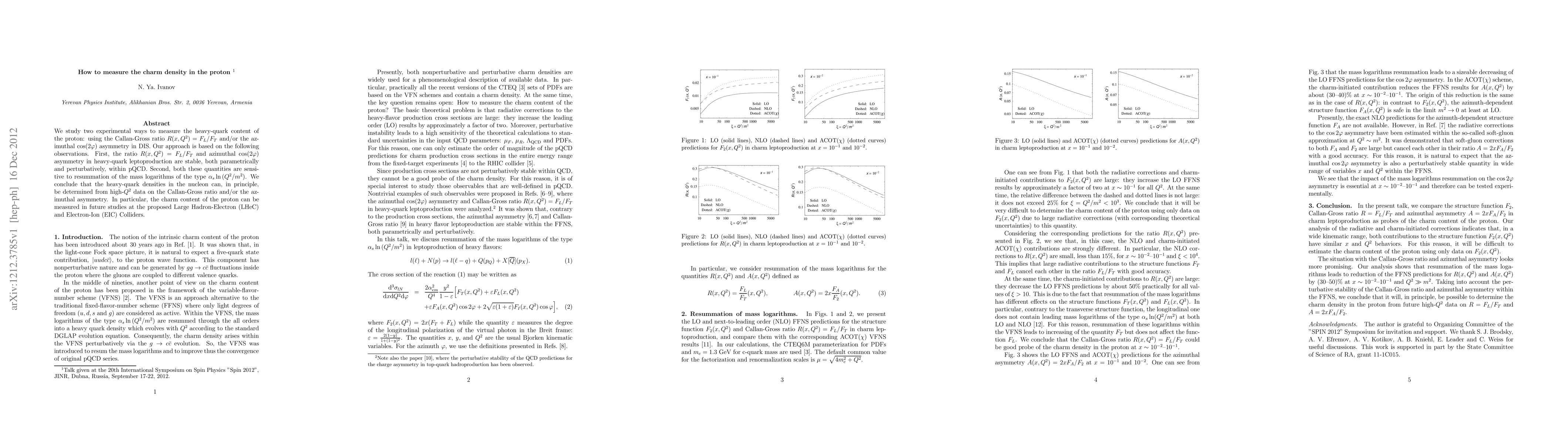 The study investigates two experimental methods for measuring heavy-quark content in the proton: utilizing the Callan-Gross ratio $R(x,Q^2)=F_L/F_T$ and the azimuthal $\cos(2\varphi)$ asymmetry in Deep Inelastic Scattering (DIS). The approach is based on the stability of $R(x,Q^2)$ and the azimuthal asymmetry within perturbative QCD (pQCD), both parametrically and perturbatively, including resummation of mass logarithms.