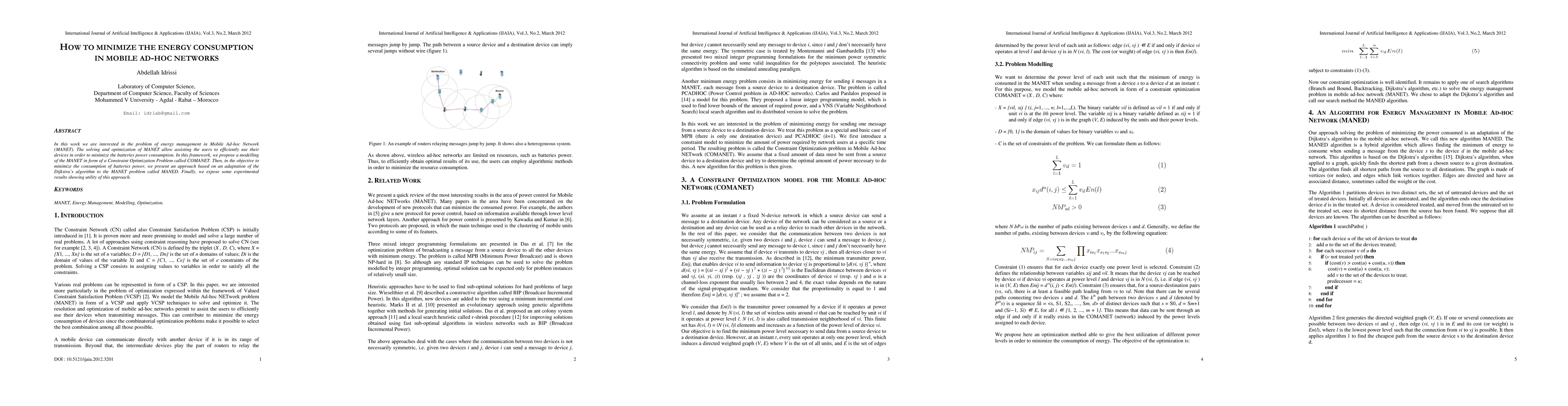 This paper proposes a new approach to minimize energy consumption in mobile ad-hoc networks using the A* algorithm adaptation called MANED. Experimental results show the effectiveness of this method.