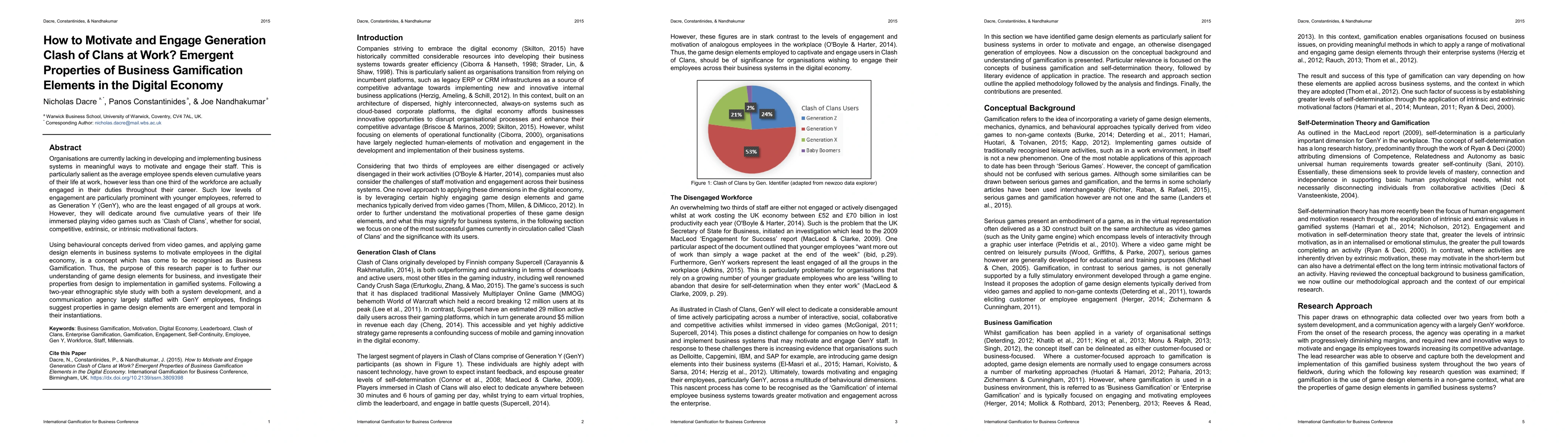 Organisations are currently lacking in developing and implementing business systems in meaningful ways to motivate and engage their staff. This is particularly salient as the average employee spends eleven cumulative years of their life at work, however less than one third of the workforce are actually engaged in their duties throughout their career. Such low levels of engagement are particularly prominent with younger employees, referred to as Generation Y (GenY), who are the least engaged of all groups at work. However, they will dedicate around five cumulative years of their life immersed playing video games such as Clash of Clans, whether for social, competitive, extrinsic, or intrinsic motivational factors. Using behavioural concepts derived from video games, and applying game design elements in business systems to motivate employees in the digital economy, is a concept which has come to be recognised as Business Gamification. Thus, the purpose of this research paper is to further our understanding of game design elements for business, and investigate their properties from design to implementation in gamified systems. Following a two-year ethnographic style study with both a system development, and a communication agency largely staffed with GenY employees, findings suggest properties in game design elements are emergent and temporal in their instantiations.