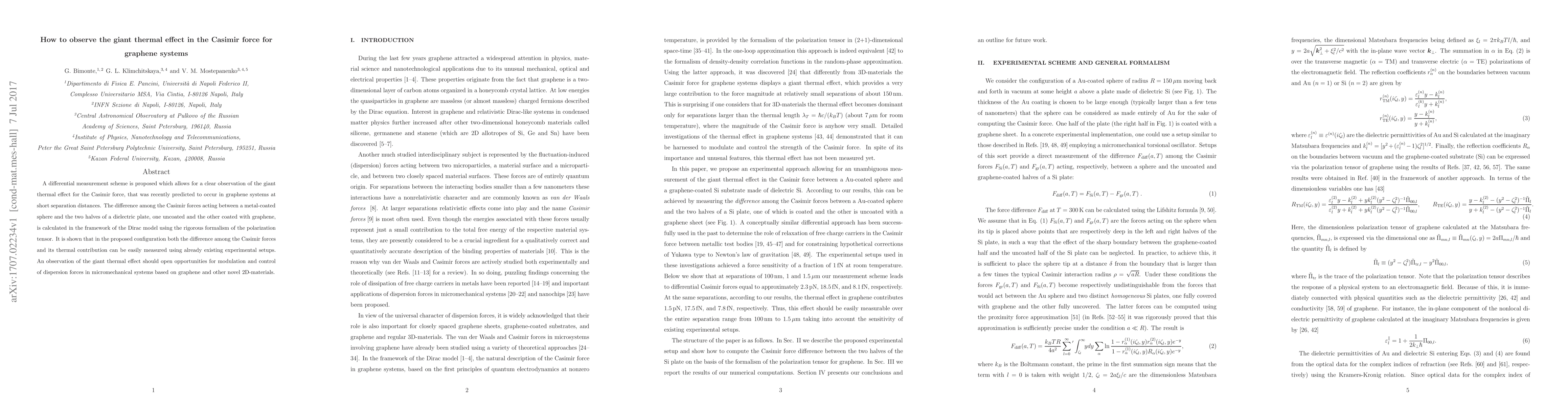 The paper proposes a differential measurement scheme to observe the giant thermal effect in the Casimir force for graphene systems, utilizing a metal-coated sphere and dielectric plates with/without graphene. This approach could enable modulation and control of dispersion forces in graphene-based micromechanical systems.