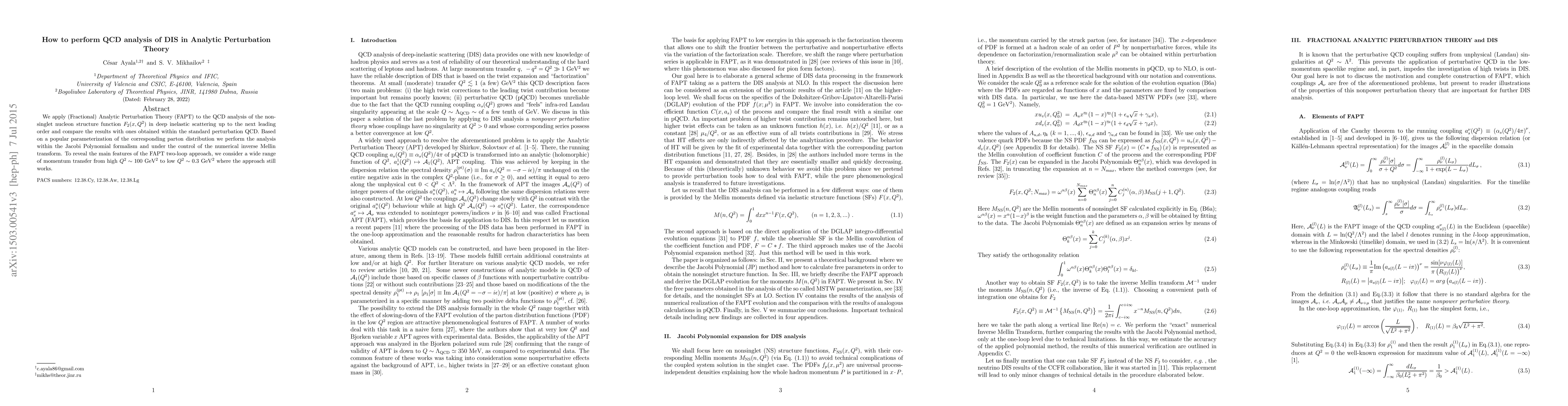 We apply (Fractional) Analytic Perturbation Theory (FAPT) to the QCD analysis of the nonsinglet nucleon structure function $F_2(x,Q^2)$ in deep inelastic scattering up to the next leading order and compare the results with ones obtained within the standard perturbation QCD. Based on a popular parameterization of the corresponding parton distribution we perform the analysis within the Jacobi Polynomial formalism and under the control of the numerical inverse Mellin transform. To reveal the main features of the FAPT two-loop approach, we consider a wide range of momentum transfer from high $Q^2\sim 100 {\rm GeV}^2$ to low $Q^2\sim 0.3 {\rm GeV}^2$ where the approach still works.