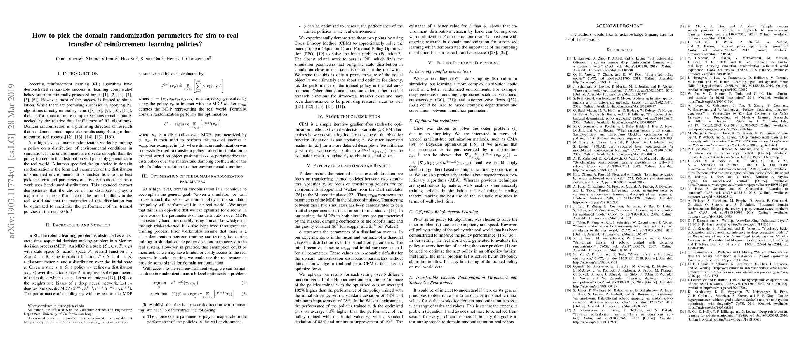 Recently, reinforcement learning (RL) algorithms have demonstrated remarkable success in learning complicated behaviors from minimally processed input. However, most of this success is limited to simulation. While there are promising successes in applying RL algorithms directly on real systems, their performance on more complex systems remains bottle-necked by the relative data inefficiency of RL algorithms. Domain randomization is a promising direction of research that has demonstrated impressive results using RL algorithms to control real robots. At a high level, domain randomization works by training a policy on a distribution of environmental conditions in simulation. If the environments are diverse enough, then the policy trained on this distribution will plausibly generalize to the real world. A human-specified design choice in domain randomization is the form and parameters of the distribution of simulated environments. It is unclear how to the best pick the form and parameters of this distribution and prior work uses hand-tuned distributions. This extended abstract demonstrates that the choice of the distribution plays a major role in the performance of the trained policies in the real world and that the parameter of this distribution can be optimized to maximize the performance of the trained policies in the real world