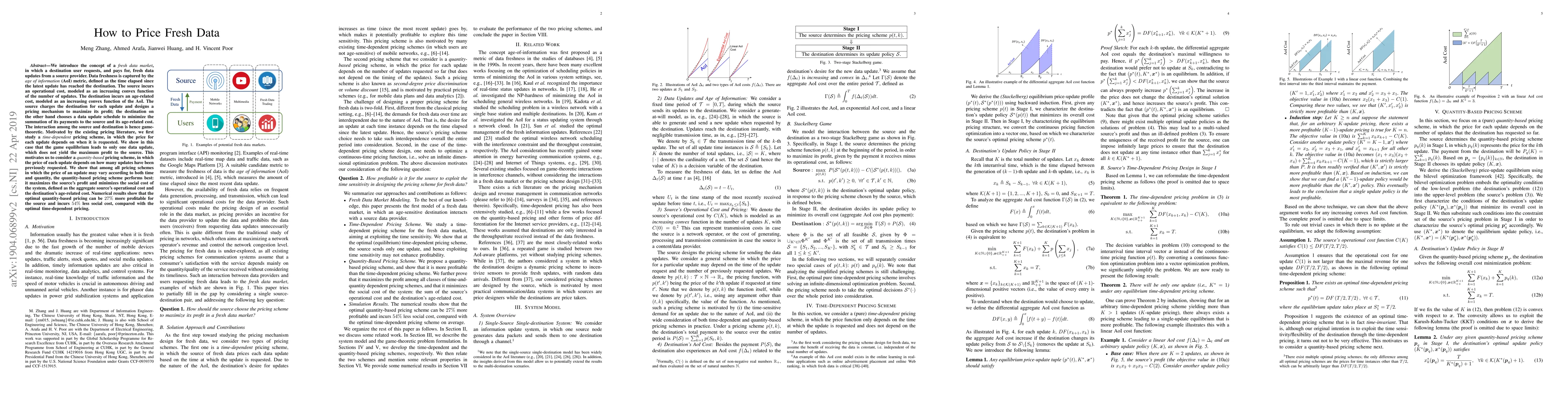 We introduce the concept of a fresh data market, in which a destination user requests, and pays for, fresh data updates from a source provider. Data freshness is captured by the {\it age of information} (AoI) metric, defined as the time elapsed since the latest update has reached the destination. The source incurs an operational cost, modeled as an increasing convex function of the number of updates. The destination incurs an age-related cost, modeled as an increasing convex function of the AoI. The source charges the destination for each update and designs a pricing mechanism to maximize its profit; the destination on the other hand chooses a data update schedule to minimize the summation of its payments to the source and its age-related cost. The interaction among the source and destination is hence game-theoretic. Motivated by the existing pricing literature, we first study a time-dependent pricing scheme, in which the price for each update depends on when it is requested. We show in this case that the game equilibrium leads to only one data update, which does not yield the maximum profit to the source. This motivates us to consider a quantity-based pricing scheme, in which the price of each update depends on how many updates have been previously requested. We show that among all pricing schemes in which the price of an update may vary according to both time and quantity, the quantity-based pricing scheme performs best: it maximizes the source's profit and minimizes the social cost of the system, defined as the aggregate source's operational cost and the destination's age-related cost. Numerical results show that the optimal quantity-based pricing can be 27% more profitable for the source and incurs 54% less social cost, compared with the optimal time-dependent pricing.