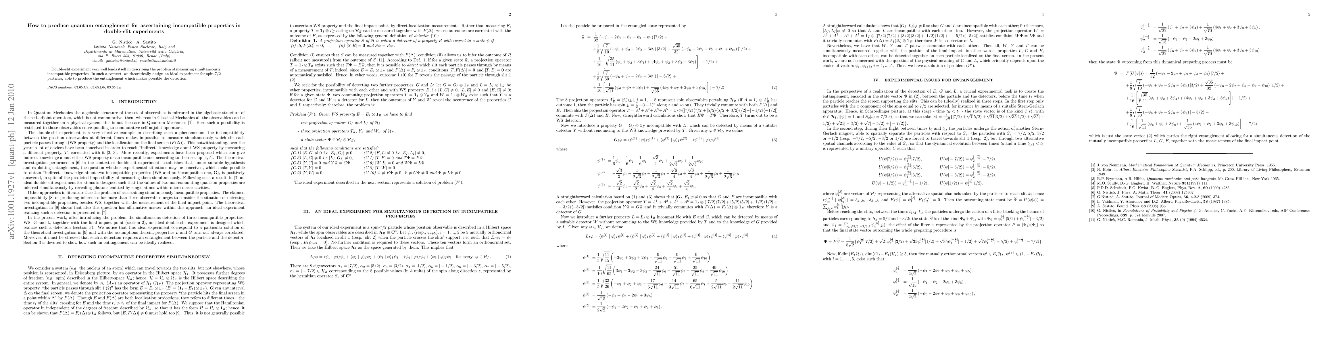 Double-slit experiment very well lends itself in describing the problem of measuring simultaneously incompatible properties. In such a context, we theoretically design an ideal experiment for spin-7/2 particles, able to produce the entanglement which makes possible the detection.