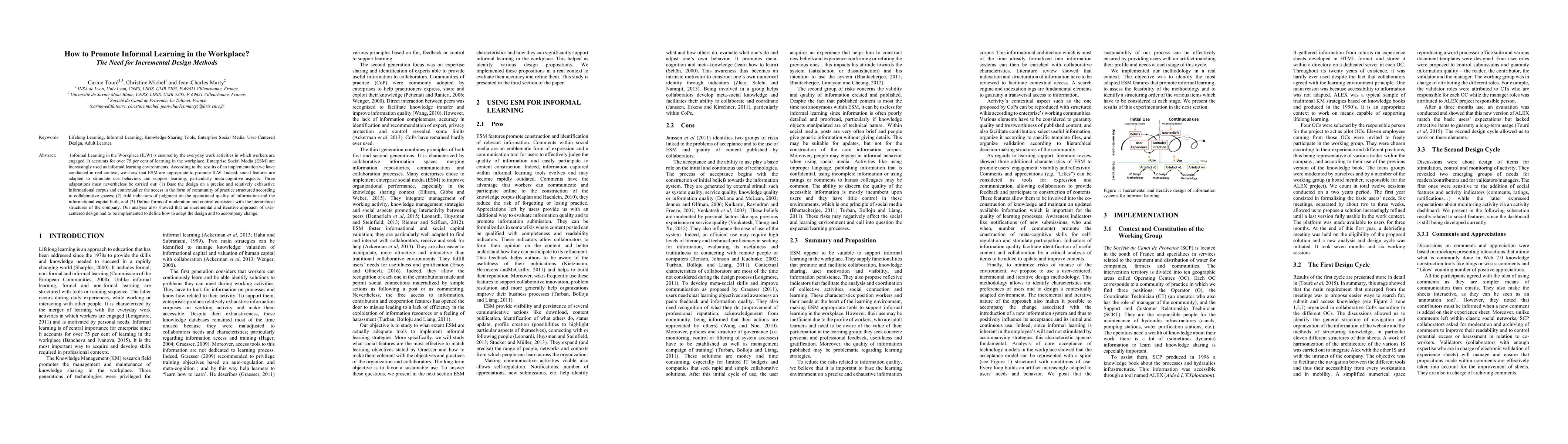 Informal Learning in the Workplace (ILW) is ensured by the everyday work activities in which workers are engaged. It accounts for over 75 per cent of learning in the workplace. Enterprise Social Media (ESM) are increasingly used as informal learning environments. According to the results of an implementation we have conducted in real context, we show that ESM are appropriate to promote ILW. Nevertheless, social aspects must be reconsidered to address users' needs regarding content and access, quality information indicators, moderation and control.