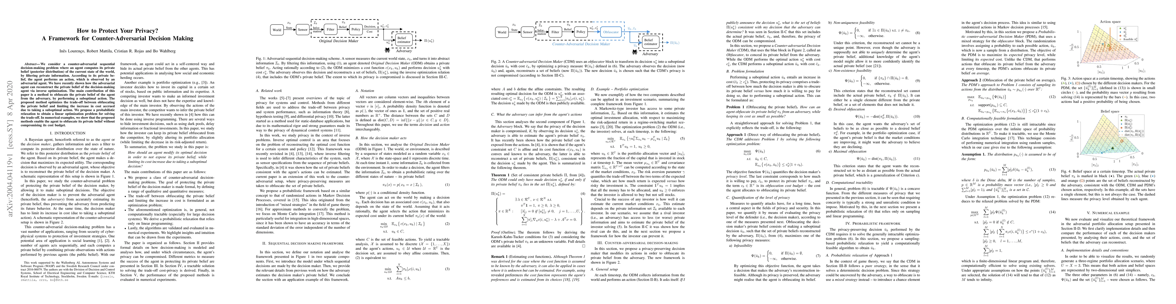 This paper presents a framework for counter-adversarial decision making to protect an agent's private belief from an adversarial observer. It proposes a method to obfuscate the agent's private belief by taking suboptimal actions, optimizing the trade-off between obfuscation and cost.