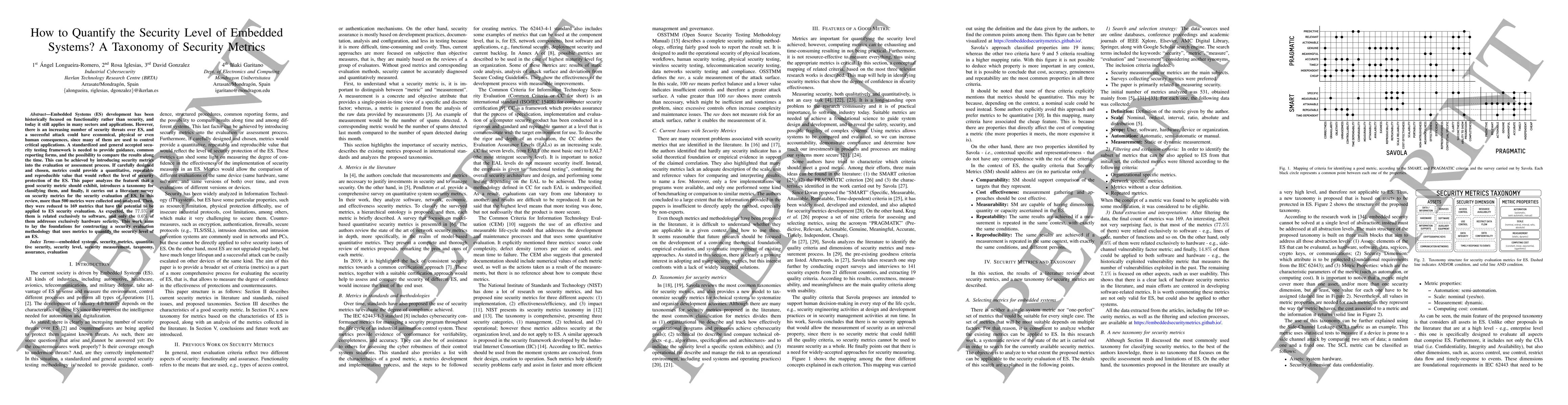 This paper proposes a taxonomy of security metrics for embedded systems, analyzing over 500 metrics to identify 169 relevant ones, aiming to establish a security evaluation methodology using metrics to quantify the security level of ES.
