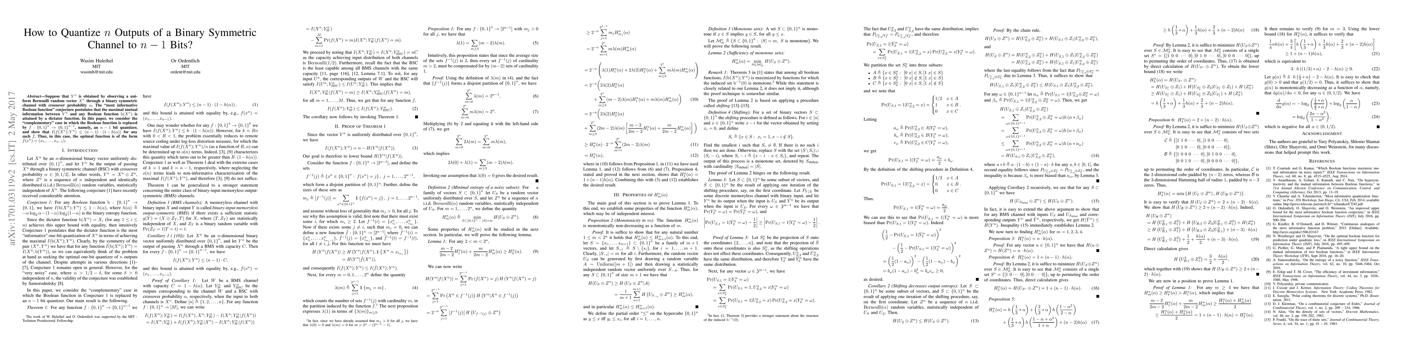 Researchers show that quantizing $n$ outputs of a binary symmetric channel to $n-1$ bits results in a mutual information of at most $(n-1)(1-h(eta))$, where $eta$ is the crossover probability, indicating an optimal function form of $f(x^n)=(x_1,oxed{...},x_{n-1})$.