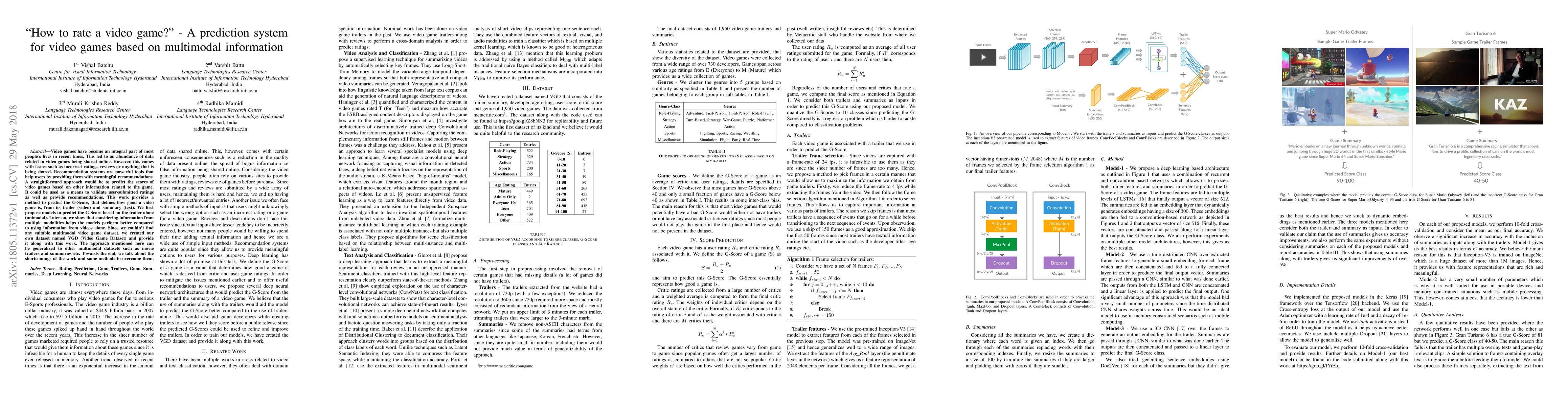 Video games have become an integral part of most people's lives in recent times. This led to an abundance of data related to video games being shared online. However, this comes with issues such as incorrect ratings, reviews or anything that is being shared. Recommendation systems are powerful tools that help users by providing them with meaningful recommendations. A straightforward approach would be to predict the scores of video games based on other information related to the game. It could be used as a means to validate user-submitted ratings as well as provide recommendations. This work provides a method to predict the G-Score, that defines how good a video game is, from its trailer (video) and summary (text). We first propose models to predict the G-Score based on the trailer alone (unimodal). Later on, we show that considering information from multiple modalities helps the models perform better compared to using information from videos alone. Since we couldn't find any suitable multimodal video game dataset, we created our own dataset named VGD (Video Game Dataset) and provide it along with this work. The approach mentioned here can be generalized to other multimodal datasets such as movie trailers and summaries etc. Towards the end, we talk about the shortcomings of the work and some methods to overcome them.