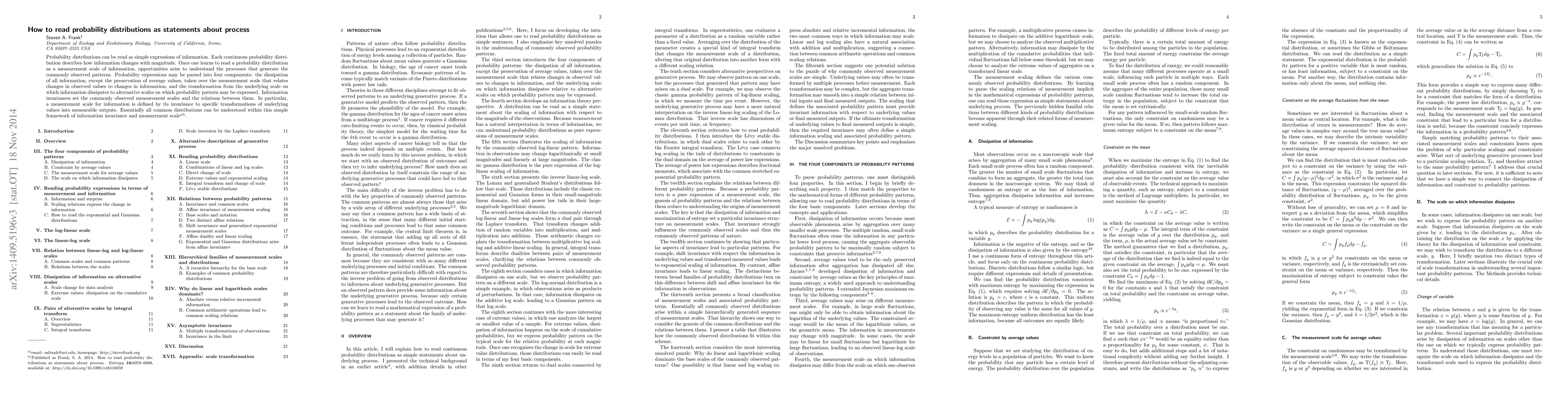 Probability distributions can be read as simple expressions of information. Each continuous probability distribution describes how information changes with magnitude. Once one learns to read a probability distribution as a measurement scale of information, opportunities arise to understand the processes that generate the commonly observed patterns. Probability expressions may be parsed into four components: the dissipation of all information, except the preservation of average values, taken over the measurement scale that relates changes in observed values to changes in information, and the transformation from the underlying scale on which information dissipates to alternative scales on which probability pattern may be expressed. Information invariances set the commonly observed measurement scales and the relations between them. In particular, a measurement scale for information is defined by its invariance to specific transformations of underlying values into measurable outputs. Essentially all common distributions can be understood within this simple framework of information invariance and measurement scale.