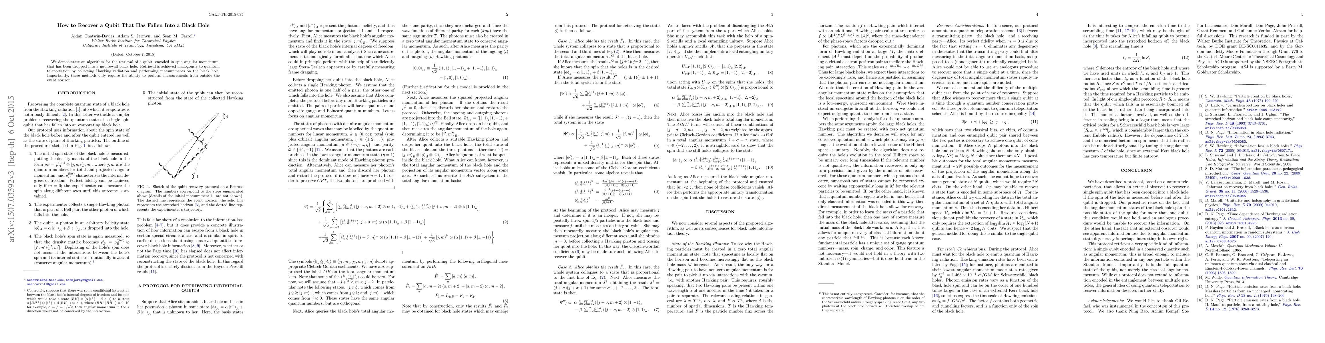 We demonstrate an algorithm for the retrieval of a qubit, encoded in spin angular momentum, that has been dropped into a no-firewall black hole. Retrieval is achieved analogously to quantum teleportation by collecting Hawking radiation and performing measurements on the black hole. Importantly, these methods only require the ability to perform measurements from outside the event horizon.