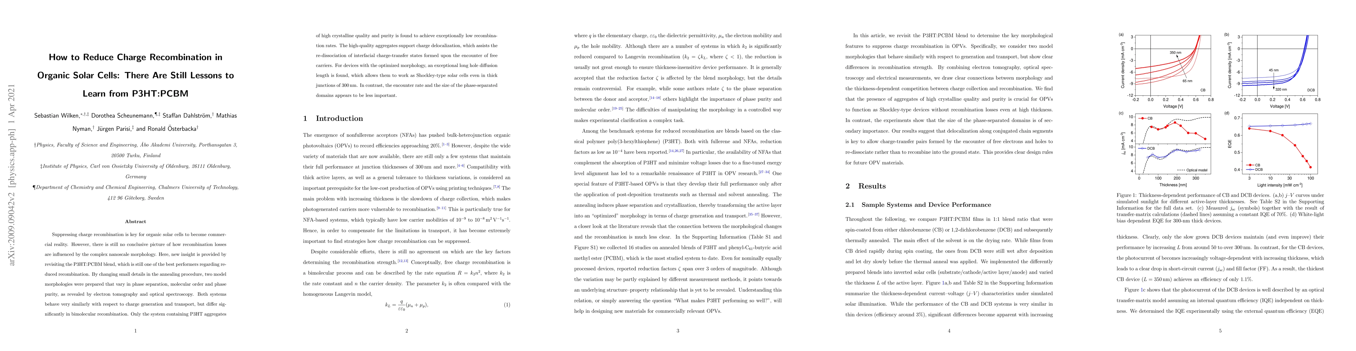 This paper investigates the role of nanoscale morphology in reducing charge recombination in organic solar cells, focusing on the P3HT:PCBM blend. Optimized morphology with high-quality P3HT aggregates significantly lowers recombination, enabling long hole diffusion lengths and efficient operation even in thick junctions.