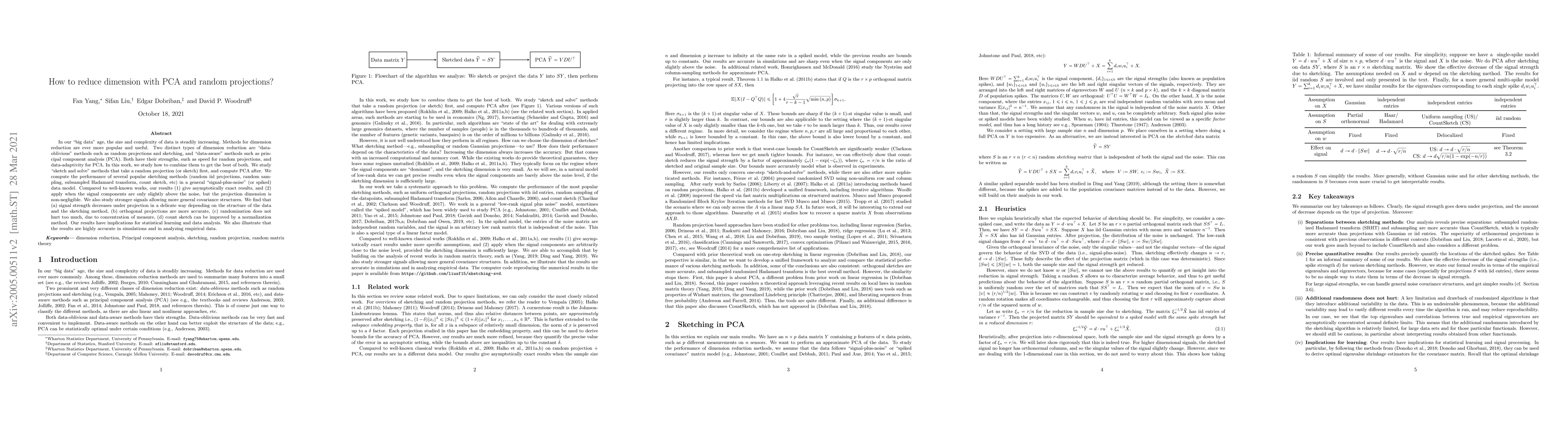 In our "big data" age, the size and complexity of data is steadily increasing. Methods for dimension reduction are ever more popular and useful. Two distinct types of dimension reduction are "data-oblivious" methods such as random projections and sketching, and "data-aware" methods such as principal component analysis (PCA). Both have their strengths, such as speed for random projections, and data-adaptivity for PCA. In this work, we study how to combine them to get the best of both. We study "sketch and solve" methods that take a random projection (or sketch) first, and compute PCA after. We compute the performance of several popular sketching methods (random iid projections, random sampling, subsampled Hadamard transform, count sketch, etc) in a general "signal-plus-noise" (or spiked) data model. Compared to well-known works, our results (1) give asymptotically exact results, and (2) apply when the signal components are only slightly above the noise, but the projection dimension is non-negligible. We also study stronger signals allowing more general covariance structures. We find that (a) signal strength decreases under projection in a delicate way depending on the structure of the data and the sketching method, (b) orthogonal projections are more accurate, (c) randomization does not hurt too much, due to concentration of measure, (d) count sketch can be improved by a normalization method. Our results have implications for statistical learning and data analysis. We also illustrate that the results are highly accurate in simulations and in analyzing empirical data.