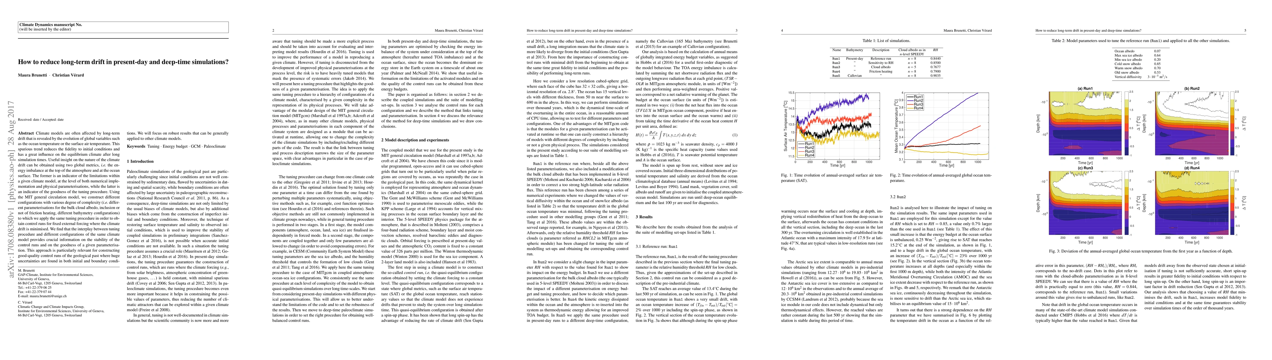 Climate models are often affected by long-term drift that is revealed by the evolution of global variables such as the ocean temperature or the surface air temperature. This spurious trend reduces the fidelity to initial conditions and has a great influence on the equilibrium climate after long simulation times. Useful insight on the nature of the climate drift can be obtained using two global metrics, i.e. the energy imbalance at the top of the atmosphere and at the ocean surface. The former is an indicator of the limitations within a given climate model, at the level of both numerical implementation and physical parameterisations, while the latter is an indicator of the goodness of the tuning procedure. Using the MIT general circulation model, we construct different configurations with various degree of complexity (i.e. different parameterisations for the bulk cloud albedo, inclusion or not of friction heating, different bathymetry configurations) to which we apply the same tuning procedure in order to obtain control runs for fixed external forcing where the climate drift is minimised. We find that the interplay between tuning procedure and different configurations of the same climate model provides crucial information on the stability of the control runs and on the goodness of a given parameterisation. This approach is particularly relevant for constructing good-quality control runs of the geological past where huge uncertainties are found in both initial and boundary conditions. We will focus on robust results that can be generally applied to other climate models.