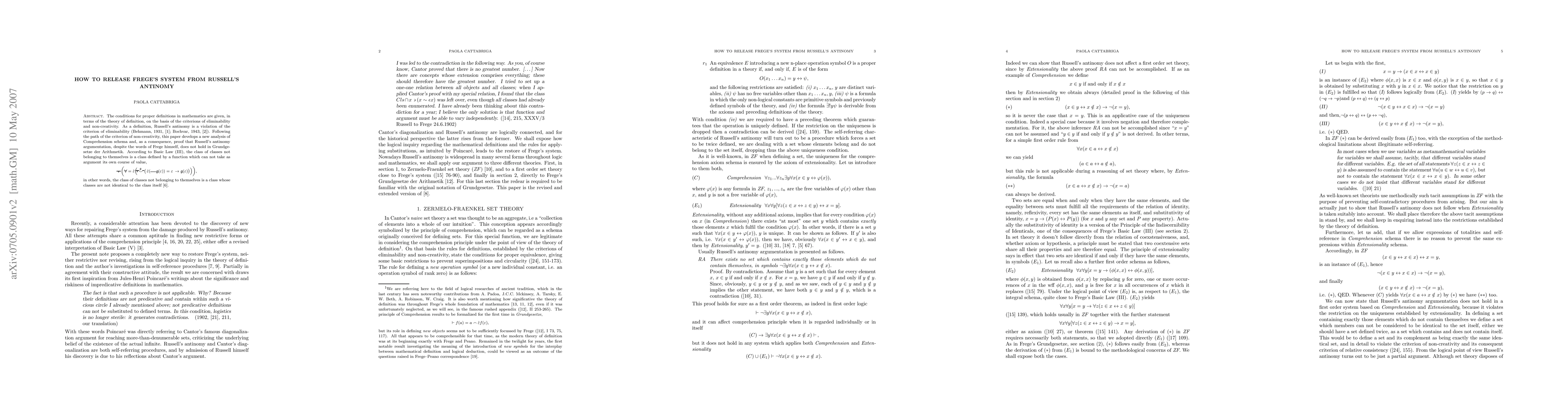 A new analysis resolves Russell's antinomy, a mathematical paradox, by showing it violates a criterion of definition in mathematics. This resolution has implications for understanding the foundations of mathematics, particularly in Frege's system.