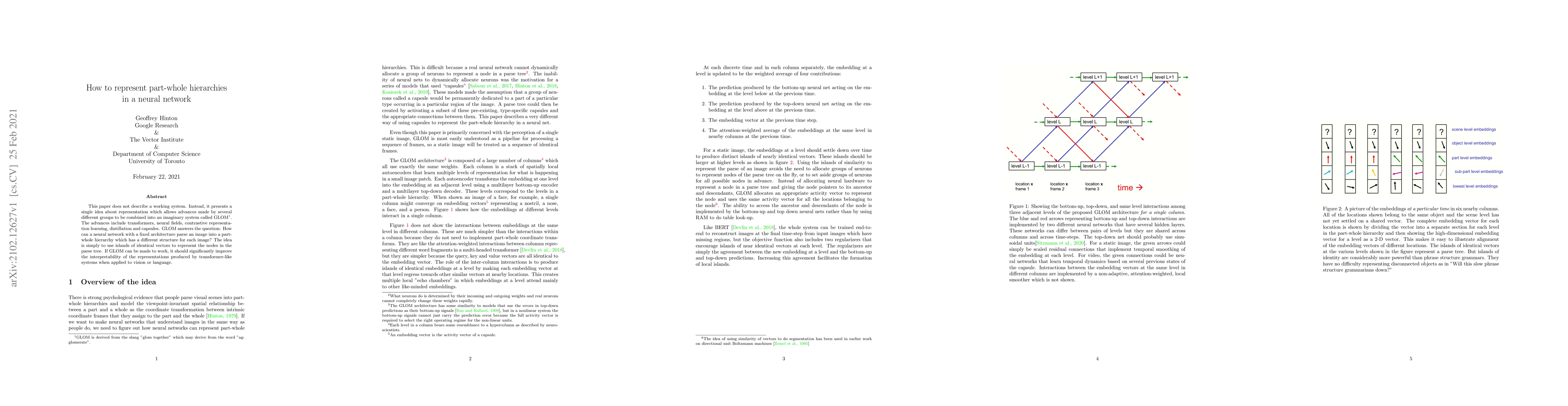 This paper proposes a novel representation idea for neural networks to parse images into part-whole hierarchies, combining advances from transformers, neural fields, and more. The concept uses islands of identical vectors to represent nodes in the parse tree, potentially enhancing the interpretability of transformer-like systems in vision and language tasks.