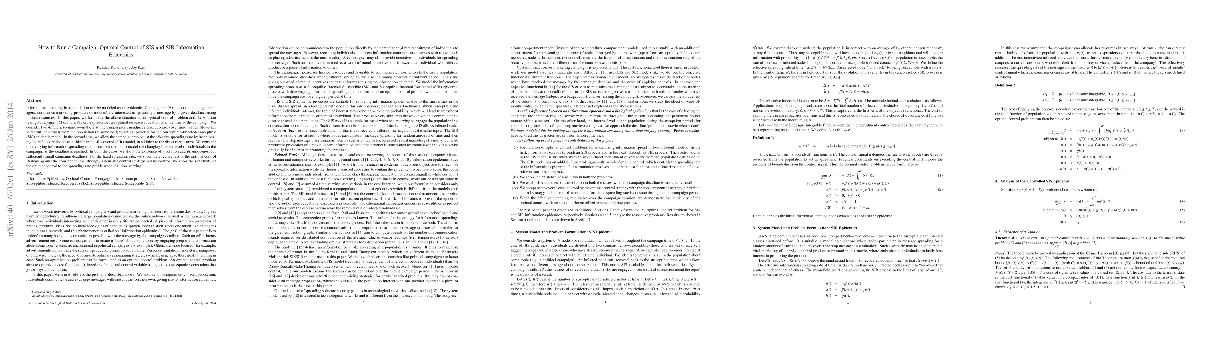 Information spreading in a population can be modeled as an epidemic. Campaigners (e.g. election campaign managers, companies marketing products or movies) are interested in spreading a message by a given deadline, using limited resources. In this paper, we formulate the above situation as an optimal control problem and the solution (using Pontryagin's Maximum Principle) prescribes an optimal resource allocation over the time of the campaign. We consider two different scenarios --- in the first, the campaigner can adjust a direct control (over time) which allows her to recruit individuals from the population (at some cost) to act as spreaders for the Susceptible-Infected-Susceptible (SIS) epidemic model. In the second case, we allow the campaigner to adjust the effective spreading rate by incentivizing the infected in the Susceptible-Infected-Recovered (SIR) model, in addition to the direct recruitment. We consider time varying information spreading rate in our formulation to model the changing interest level of individuals in the campaign, as the deadline is reached. In both the cases, we show the existence of a solution and its uniqueness for sufficiently small campaign deadlines. For the fixed spreading rate, we show the effectiveness of the optimal control strategy against the constant control strategy, a heuristic control strategy and no control. We show the sensitivity of the optimal control to the spreading rate profile when it is time varying.
