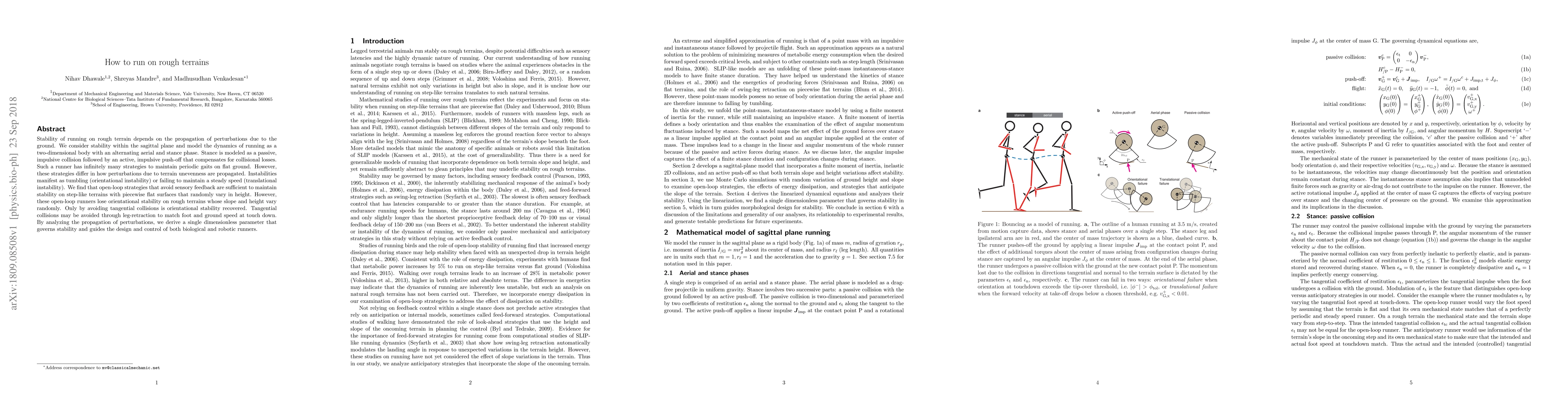 This paper investigates the stability of running on rough terrains by modeling the dynamics of running as a two-dimensional body with alternating aerial and stance phases. It finds that open-loop strategies suffice for step-like terrains but fail on rough terrains, where tangential collisions disrupt stability, which can be avoided through leg-retraction to match foot and ground speed, guided by a derived dimensionless stability parameter.