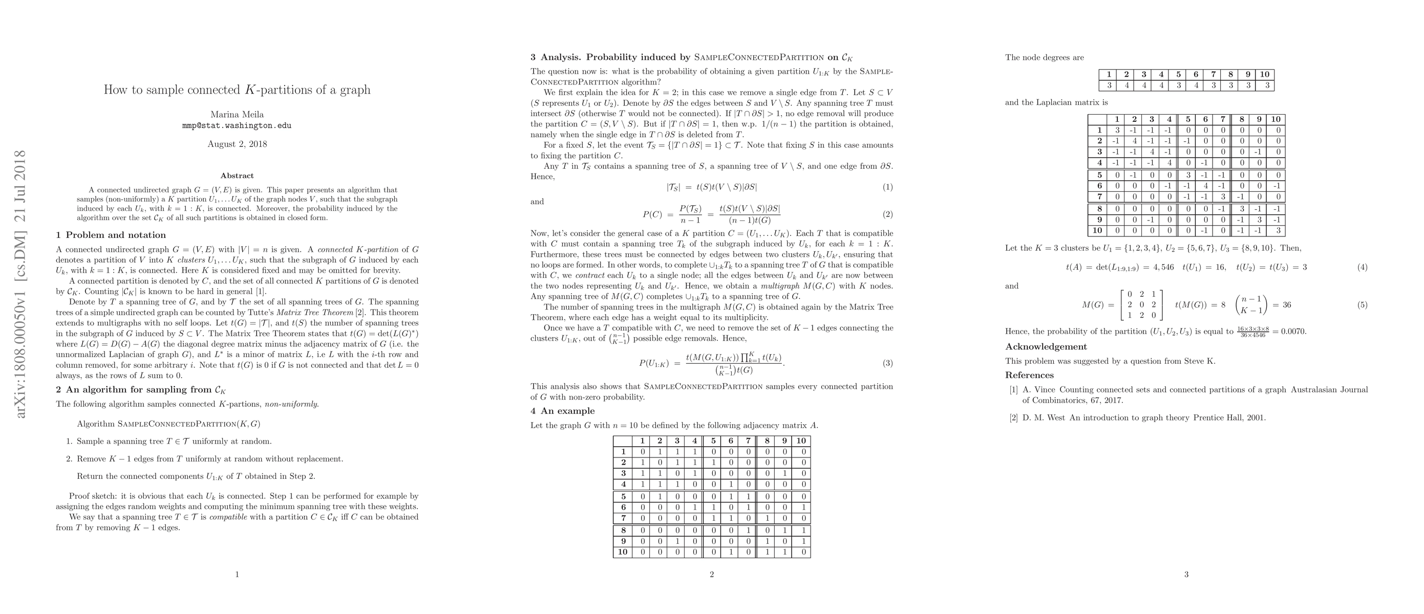 The paper presents an algorithm, SampleConnectedPartition, that non-uniformly samples a connected K-partition of a graph's nodes, ensuring the subgraph induced by each partition is connected. The probability induced by this algorithm over the set of all such partitions is derived in closed form.