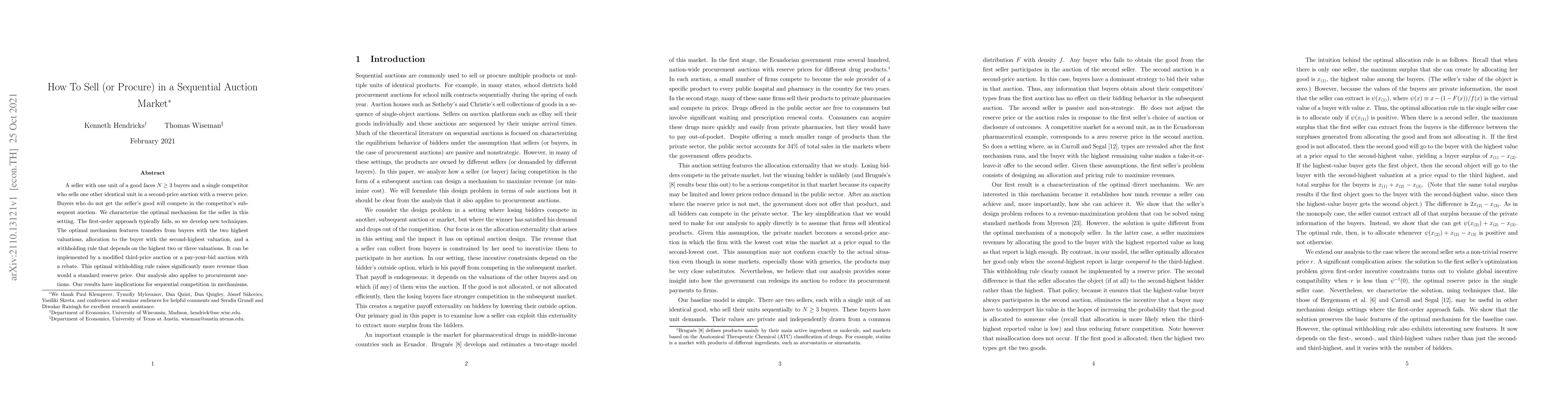A seller with one unit of a good faces N\geq3 buyers and a single competitor who sells one other identical unit in a second-price auction with a reserve price. Buyers who do not get the seller's good will compete in the competitor's subsequent auction. We characterize the optimal mechanism for the seller in this setting. The first-order approach typically fails, so we develop new techniques. The optimal mechanism features transfers from buyers with the two highest valuations, allocation to the buyer with the second-highest valuation, and a withholding rule that depends on the highest two or three valuations. It can be implemented by a modified third-price auction or a pay-your-bid auction with a rebate. This optimal withholding rule raises significantly more revenue than would a standard reserve price. Our analysis also applies to procurement auctions. Our results have implications for sequential competition in mechanisms.