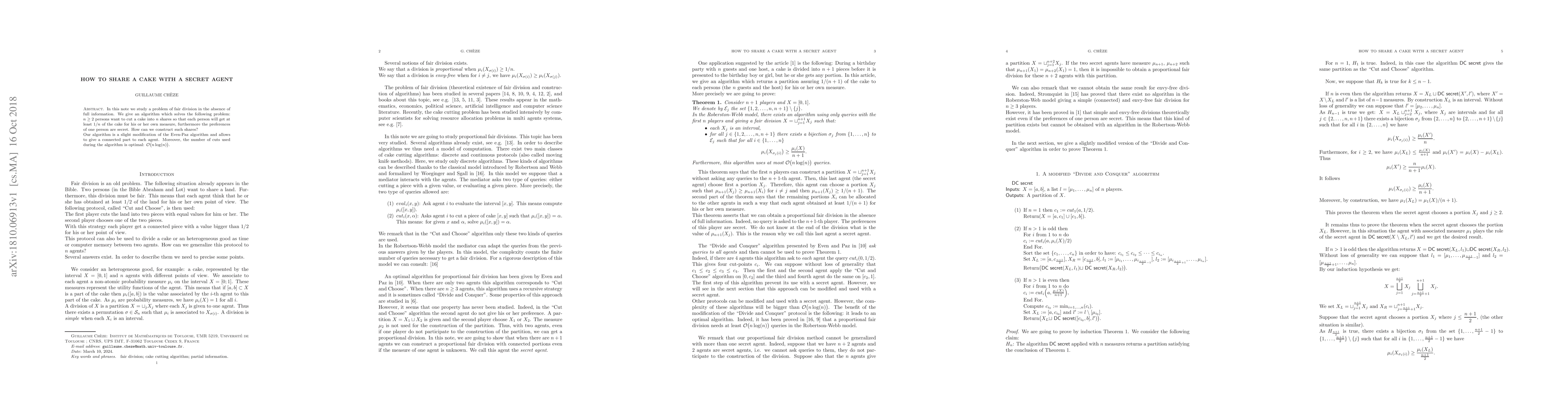 In this note we study a problem of fair division in the absence of full information. We give an algorithm which solves the following problem: n $\ge$ 2 persons want to cut a cake into n shares so that each person will get at least 1/n of the cake for his or her own measure, furthermore the preferences of one person are secret. How can we construct such shares? Our algorithm is a slight modification of the Even-Paz algorithm and allows to give a connected part to each agent. Moreover, the number of cuts used during the algorithm is optimal: O (n log(n)) .