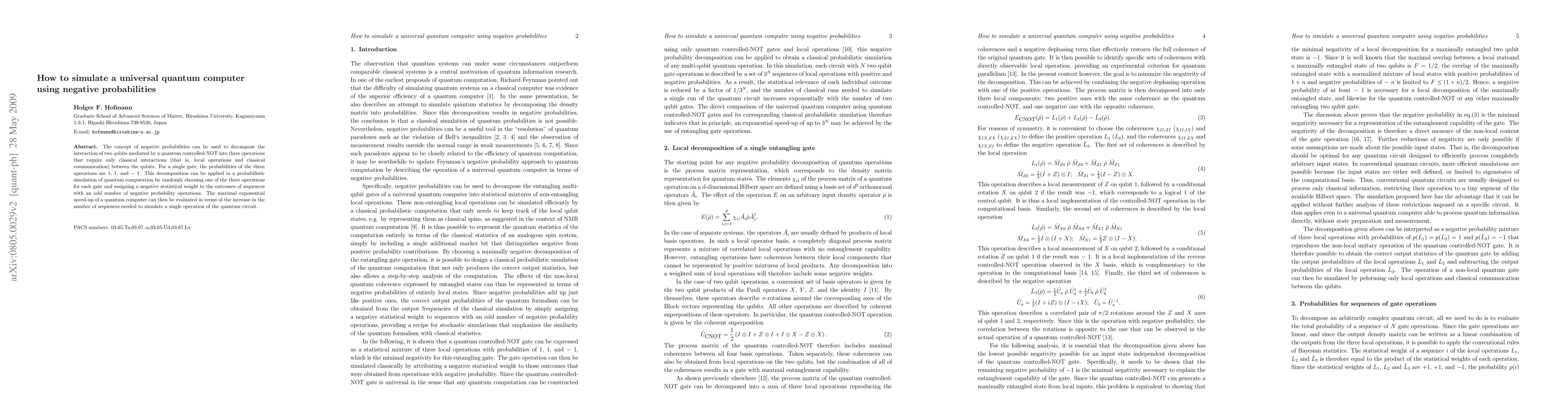 The concept of negative probabilities can be used to decompose the interaction of two qubits mediated by a quantum controlled-NOT into three operations that require only classical interactions (that is, local operations and classical communication) between the qubits. For a single gate, the probabilities of the three operations are 1, 1, and -1. This decomposition can be applied in a probabilistic simulation of quantum computation by randomly choosing one of the three operations for each gate and assigning a negative statistical weight to the outcomes of sequences with an odd number of negative probability operations. The exponential speed-up of a quantum computer can then be evaluated in terms of the increase in the number of sequences needed to simulate a single operation of the quantum circuit.