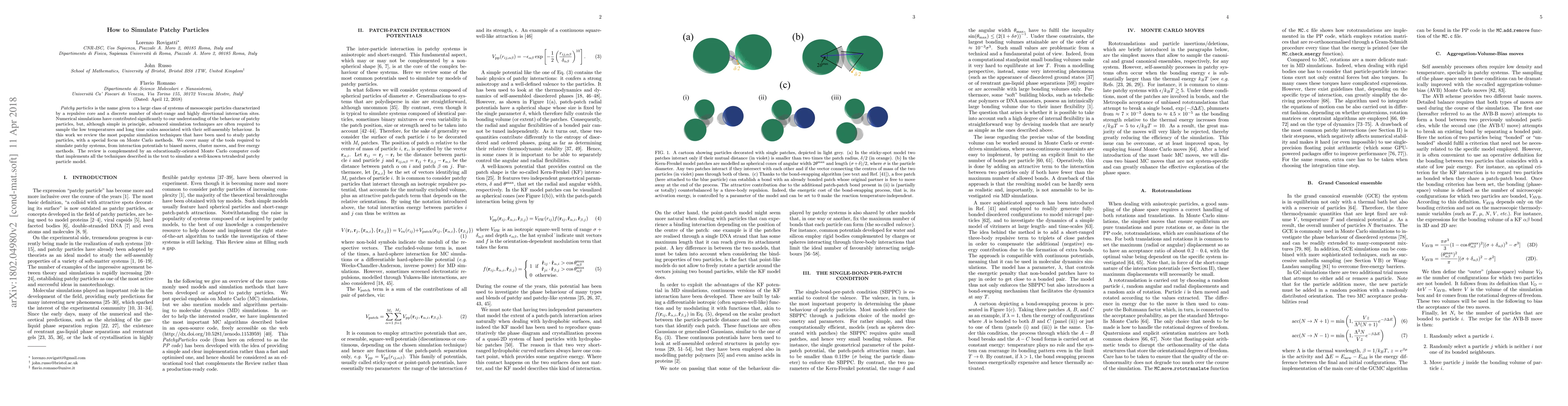 The paper reviews popular simulation techniques for patchy particles, with a focus on Monte Carlo methods, covering interaction potentials, biased moves, cluster moves, and free energy methods.