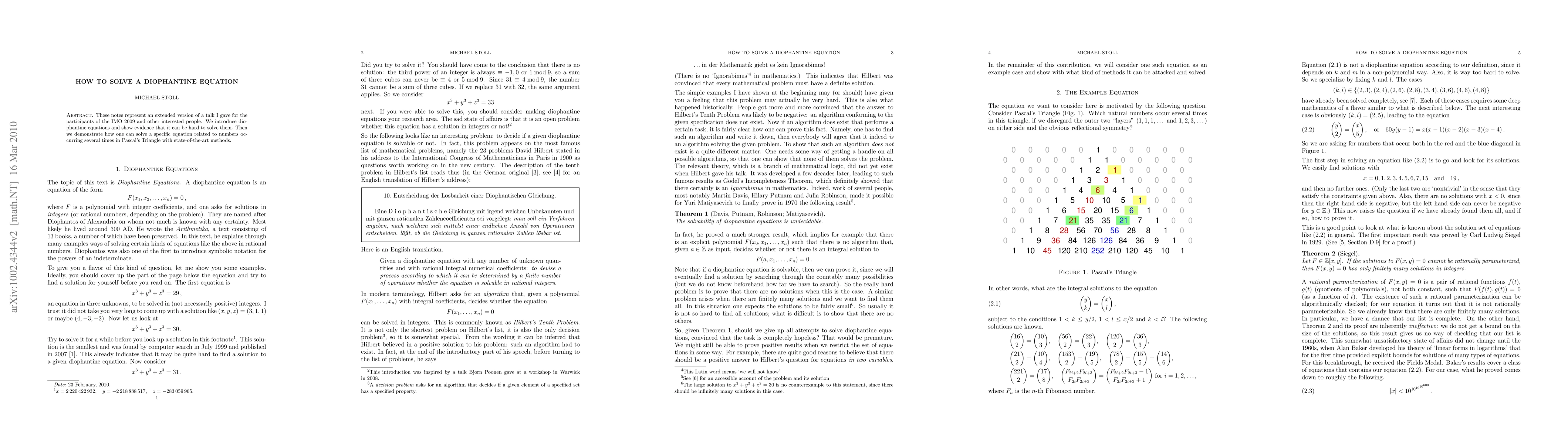 These notes represent an extended version of a talk I gave for the participants of the IMO 2009 and other interested people. We introduce diophantine equations and show evidence that it can be hard to solve them. Then we demonstrate how one can solve a specific equation related to numbers occurring several times in Pascal's Triangle with state-of-the-art methods.