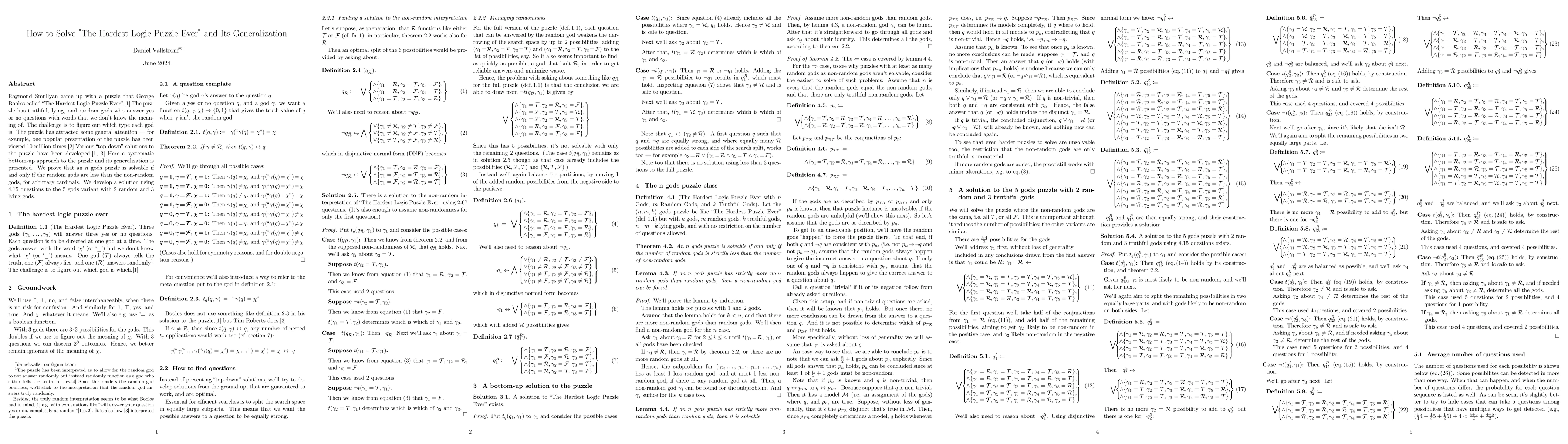 This paper presents a systematic bottom-up approach to solving Raymond Smullyan's famed "Hardest Logic Puzzle Ever," demonstrating its solvability based on the ratio of random to non-random gods. The authors generalize the solution and provide a precise number of questions needed for specific configurations.