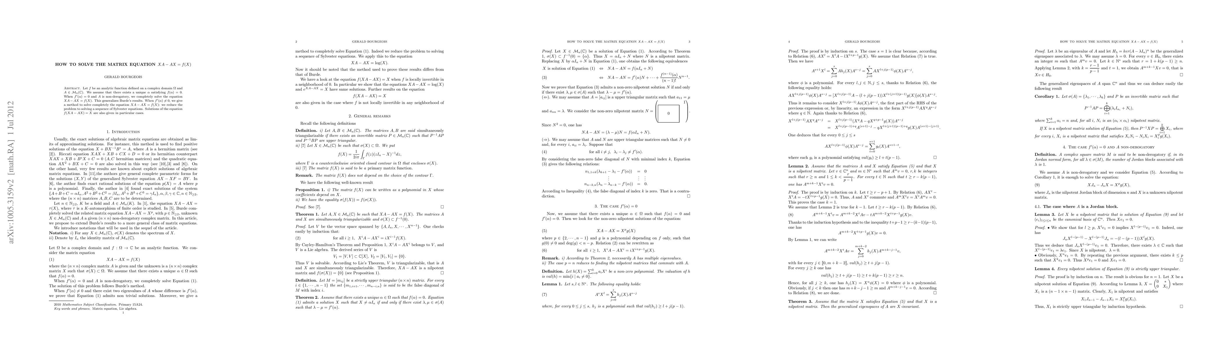 The paper presents a detailed analysis and solution method for the matrix equation XA - AX = f(X), where f is an analytic function on a complex domain Omega and A is an n x n complex matrix. The authors solve the equation under specific conditions, generalizing Burde's results and providing methods for cases where f'(alpha) is not zero.