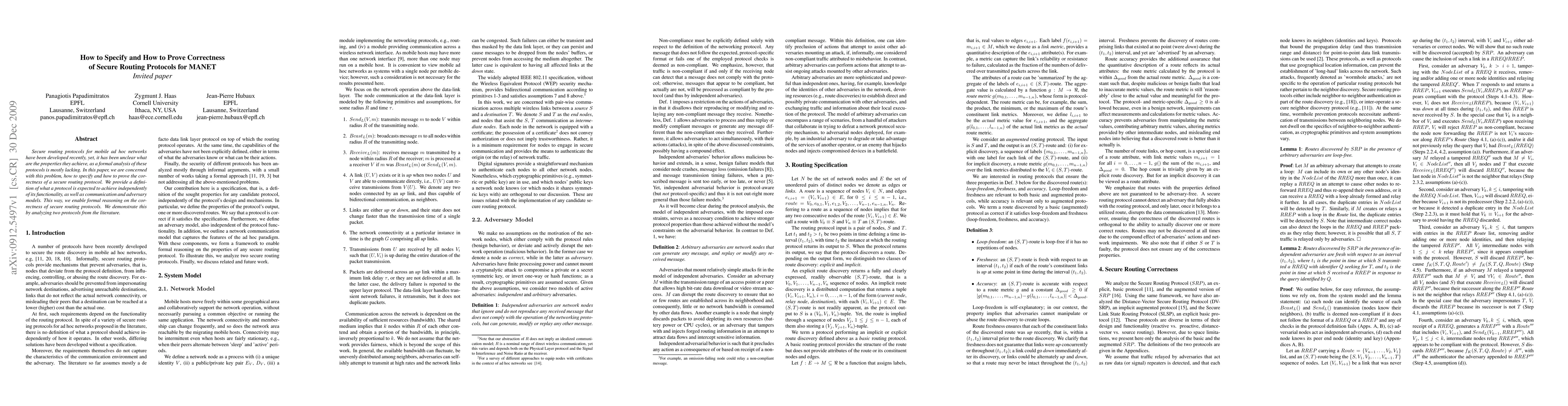 Secure routing protocols for mobile ad hoc networks have been developed recently, yet, it has been unclear what are the properties they achieve, as a formal analysis of these protocols is mostly lacking. In this paper, we are concerned with this problem, how to specify and how to prove the correctness of a secure routing protocol. We provide a definition of what a protocol is expected to achieve independently of its functionality, as well as communication and adversary models. This way, we enable formal reasoning on the correctness of secure routing protocols. We demonstrate this by analyzing two protocols from the literature.