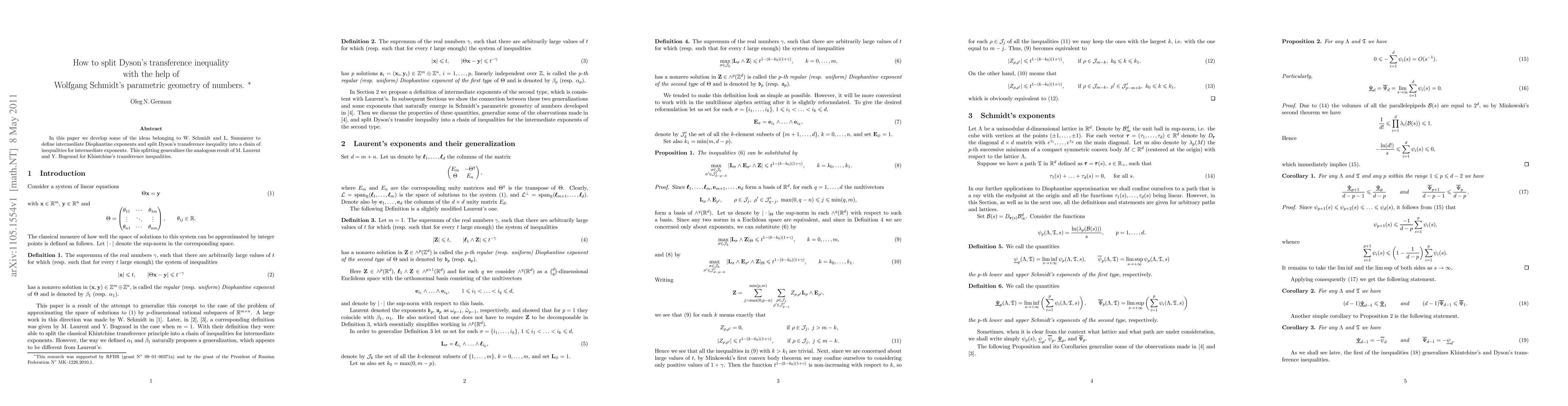 This paper utilizes ideas from Wolfgang Schmidt and L. Summerer to define intermediate Diophantine exponents and split Dyson's transference inequality into a series of inequalities for these intermediate exponents, generalizing a similar result for Khintchine's transference inequalities by M. Laurent and Y. Bugeaud.