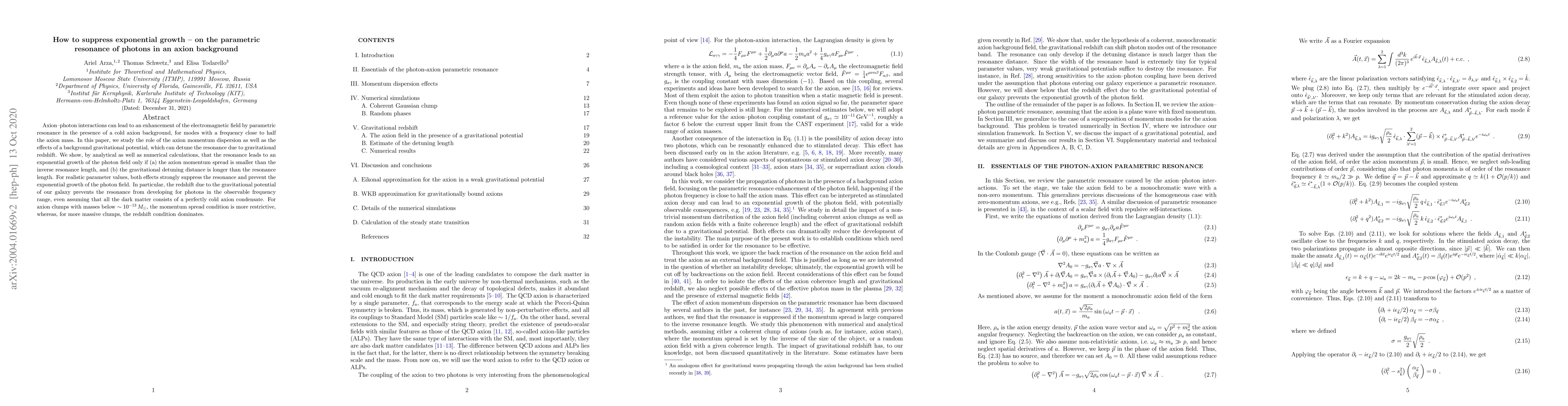 Axion--photon interactions can lead to an enhancement of the electromagnetic field by parametric resonance in the presence of a cold axion background, for modes with a frequency close to half the axion mass. In this paper, we study the role of the axion momentum dispersion as well as the effects of a background gravitational potential, which can detune the resonance due to gravitational redshift. We show, by analytical as well as numerical calculations, that the resonance leads to an exponential growth of the photon field only if (a) the axion momentum spread is smaller than the inverse resonance length, and (b) the gravitational detuning distance is longer than the resonance length. For realistic parameter values, both effects strongly suppress the resonance and prevent the exponential growth of the photon field. In particular, the redshift due to the gravitational potential of our galaxy prevents the resonance from developing for photons in the observable frequency range, even assuming that all the dark matter consists of a perfectly cold axion condensate. For axion clumps with masses below $\sim 10^{-13}\, M_\odot$, the momentum spread condition is more restrictive, whereas, for more massive clumps, the redshift condition dominates.