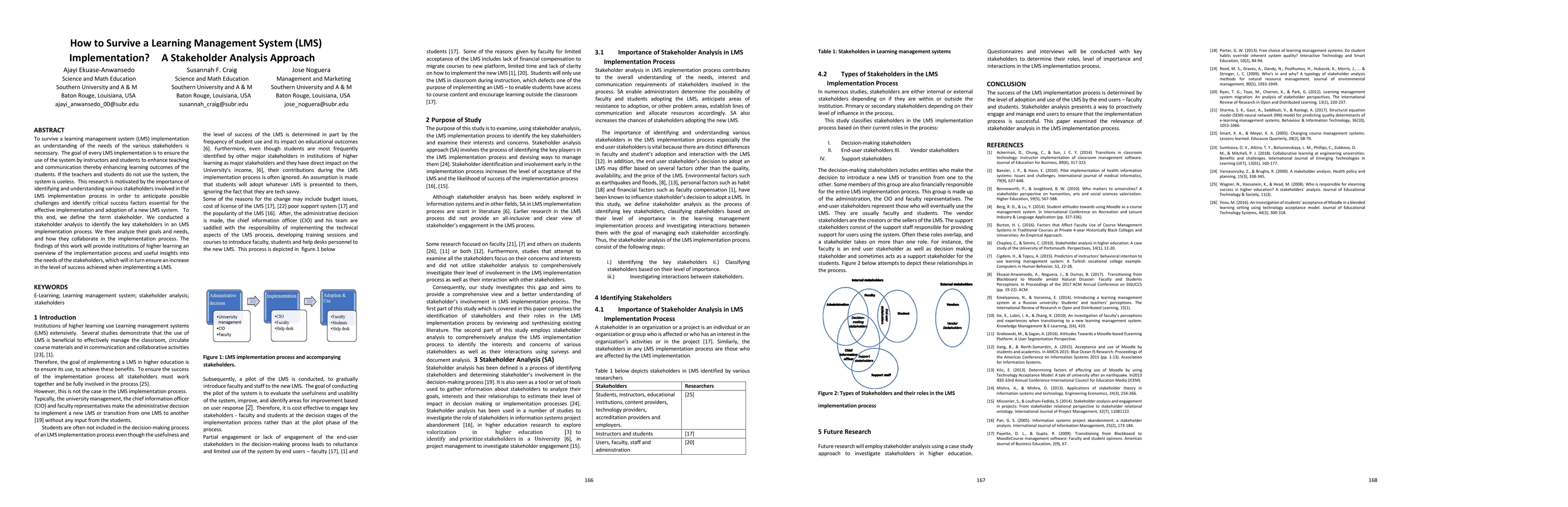 This paper explores the critical role of stakeholder analysis in the successful implementation of a learning management system (LMS). By identifying and understanding the goals and needs of various stakeholders, institutions can better navigate challenges and enhance the adoption and effectiveness of the LMS.