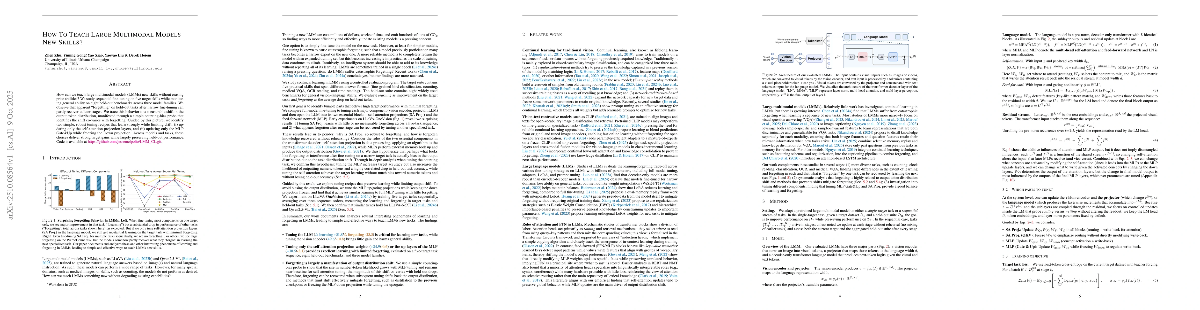 How can we teach large multimodal models (LMMs) new skills without erasing prior abilities? We study sequential fine-tuning on five target skills while monitoring general ability on eight held-out benchmarks across three model families. We observe that apparent "forgetting" on held-out tasks after narrow fine-tuning can partly recover at later stages. We trace this behavior to a measurable shift in the output token distribution, manifested through a simple counting-bias probe that co-varies with forgetting. Guided by this picture, we identify two simple, robust tuning recipes that learn strongly while limiting drift: (i) updating only the self-attention projection layers, and (ii) updating only the MLP Gate&Up while freezing the Down projection. Across models and tasks, these choices deliver strong target gains while largely preserving held-out performance. Code is available at https://github.com/jessemelpolio/LMM_CL